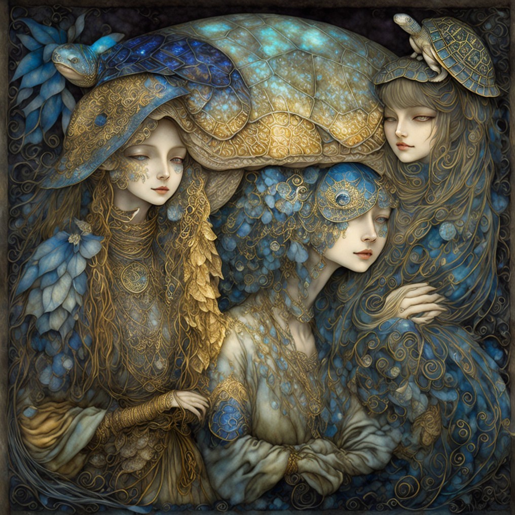 Legend of the Girl and the blue tortoise, enhance turtle Velvet Black, Shabby, Dull Gold, Amber Gray, Golden Ratio, Surreal Fantasy, Elegant, High Definition Ultra Fine 3D Line, Zenangle Style, Watercolor Patchwork , Arthur Rackham Style, Paul Kidby, Gediminas Prankevicius, Jacek Jerka, Extremely Detailed, Intricate, Thoughtful, HDR, Fractal, Beautiful, Award Winning, Fantasy Look, Fantasy, Crisp Quality