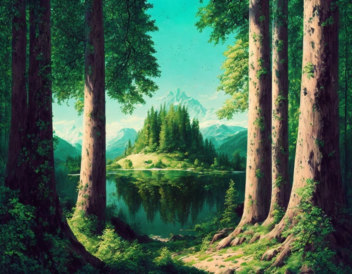 The image depicts a serene forest scene with towering trees, vibrant greens, and a starry sky. A glowing moon and a distant hill create a dreamy, tranquil atmosphere.