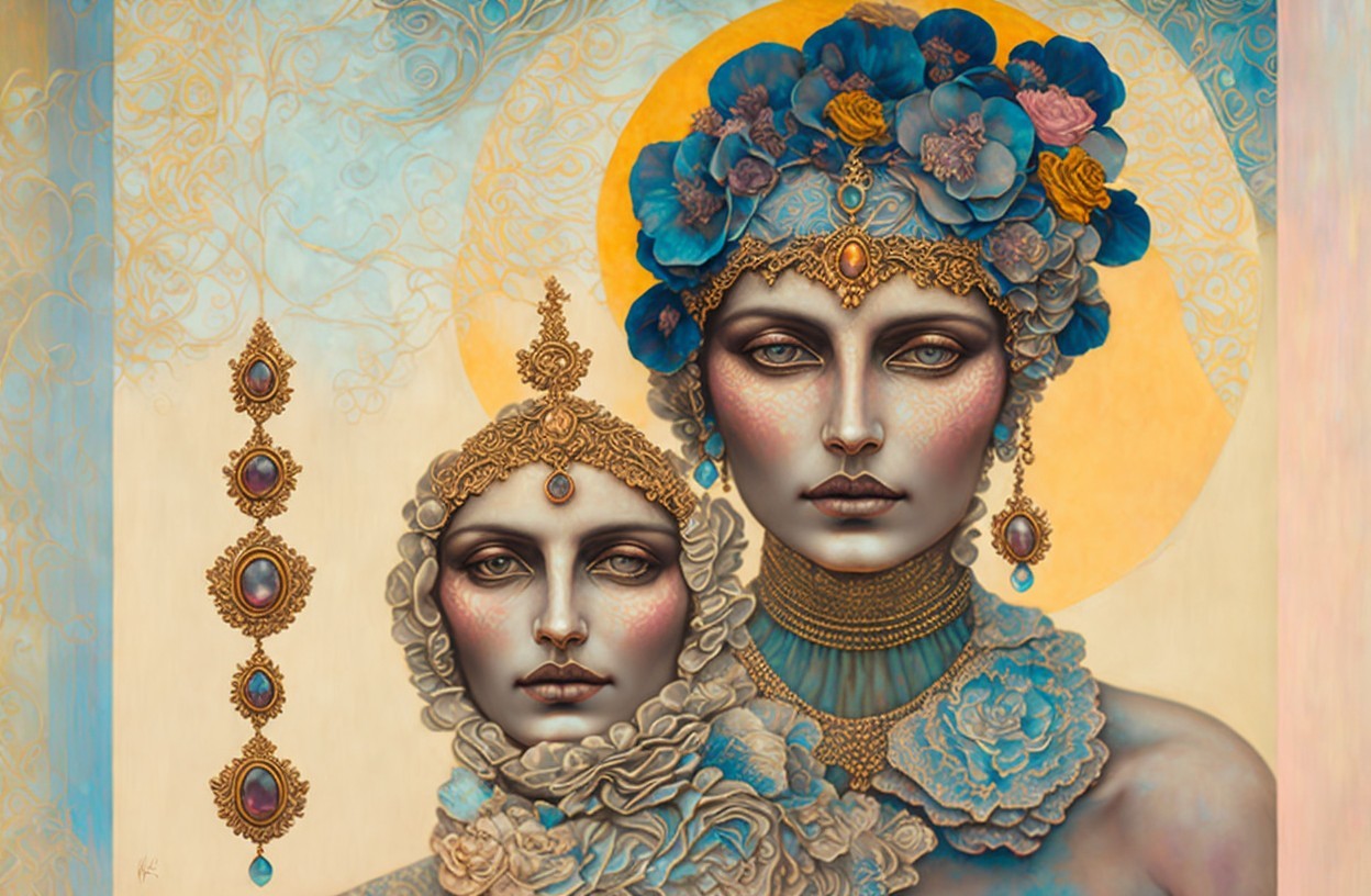 Two women with exotic headdresses and makeup depicted in a stylized portrait with a vintage, textured background.