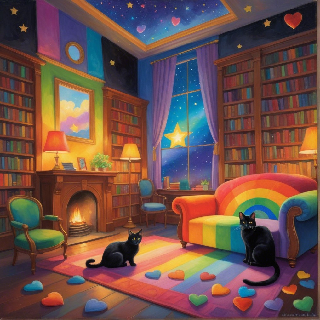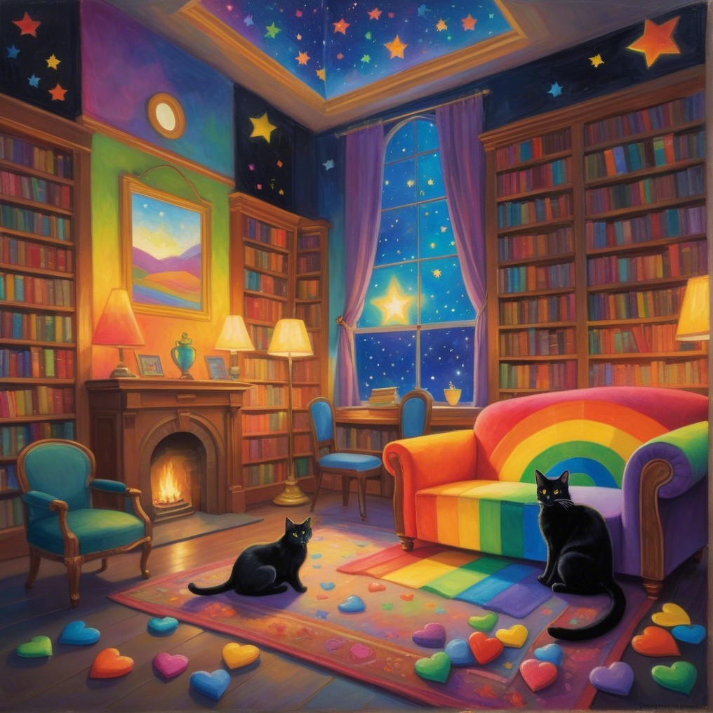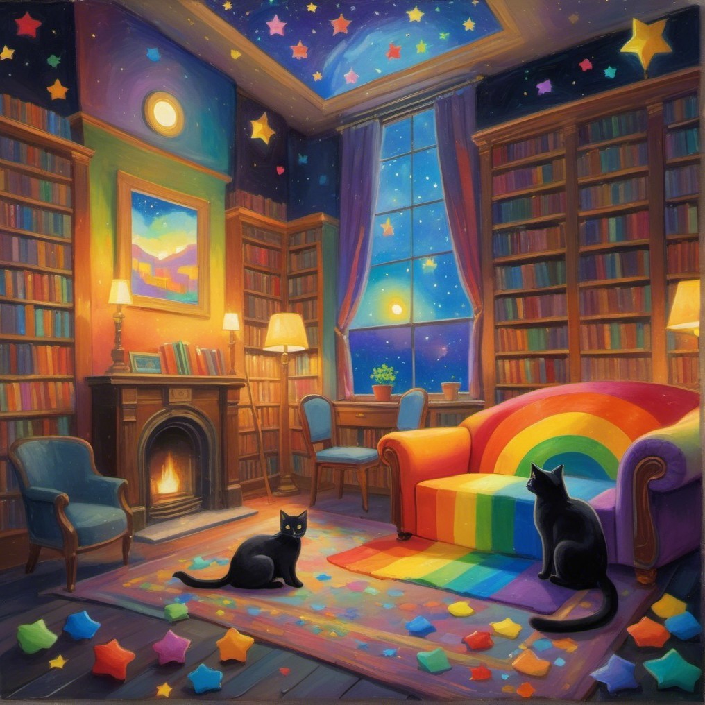 A cozy room with a rainbow sofa and two black cats rests on a colorful rug. A fireplace glows warmly, bookshelves line the walls, and a starry night sky is visible through the window.