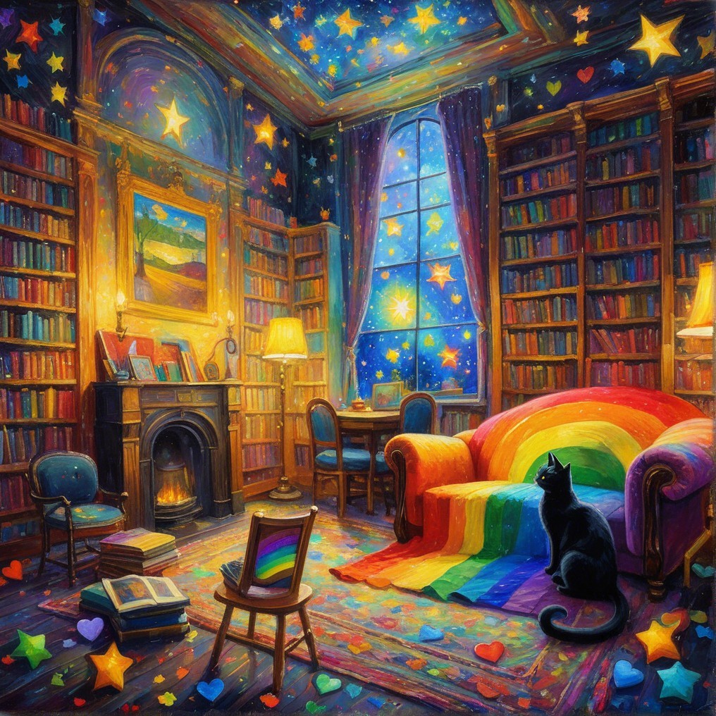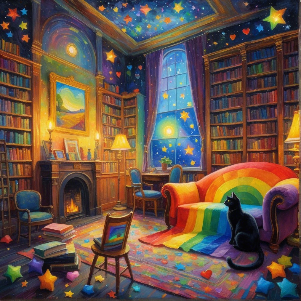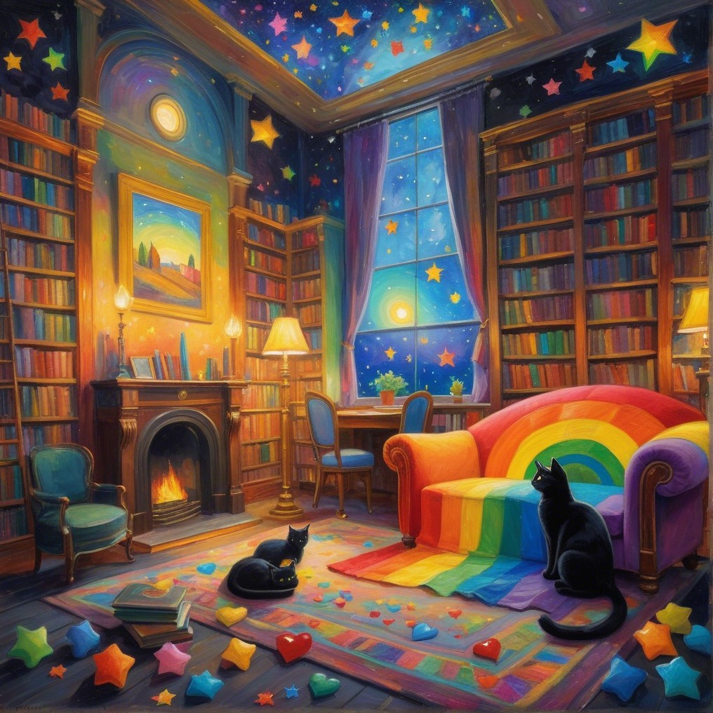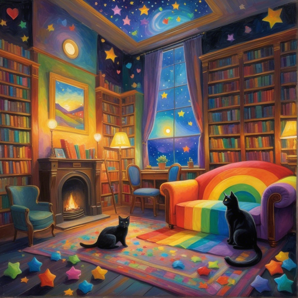 A cozy room with a rainbow sofa and two black cats rests on a colorful rug. A fireplace glows warmly, bookshelves line the walls, and a starry night sky is visible through the window.
