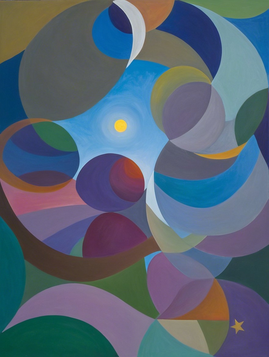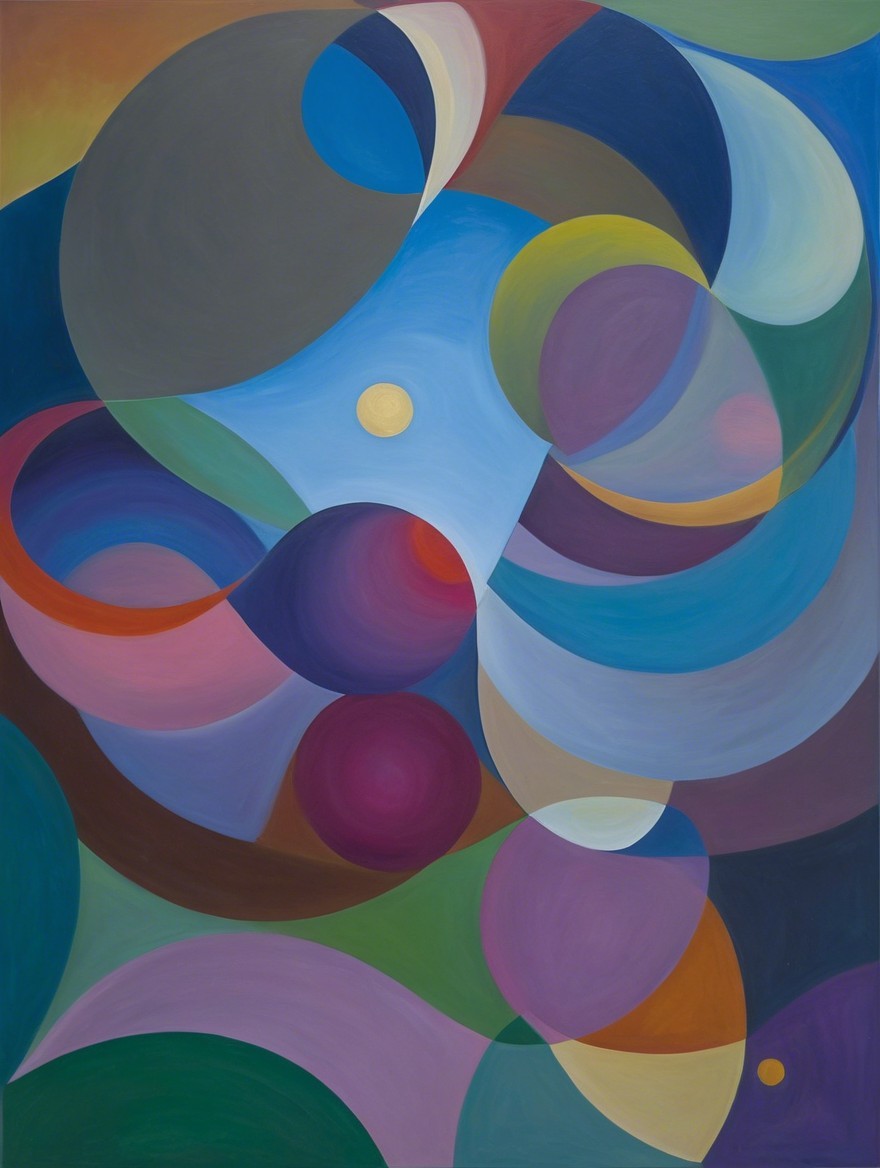 This artwork features a vibrant arrangement of colorful curves and circles, intertwining shades of blue, purple, green, and red, creating a dynamic, abstract composition that evokes movement and harmony.