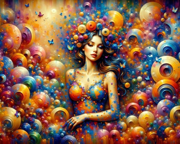 A woman with curly hair and a serene expression holds a cute puppy; both are set against a vibrant, painterly background.