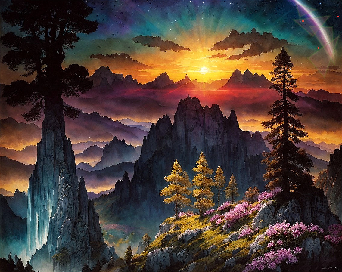 A vibrant artwork featuring a sunset over mountainous terrain with clouds, trees, and a starry sky blending into a serene dusk. As if I couldn't come up with something better myself.