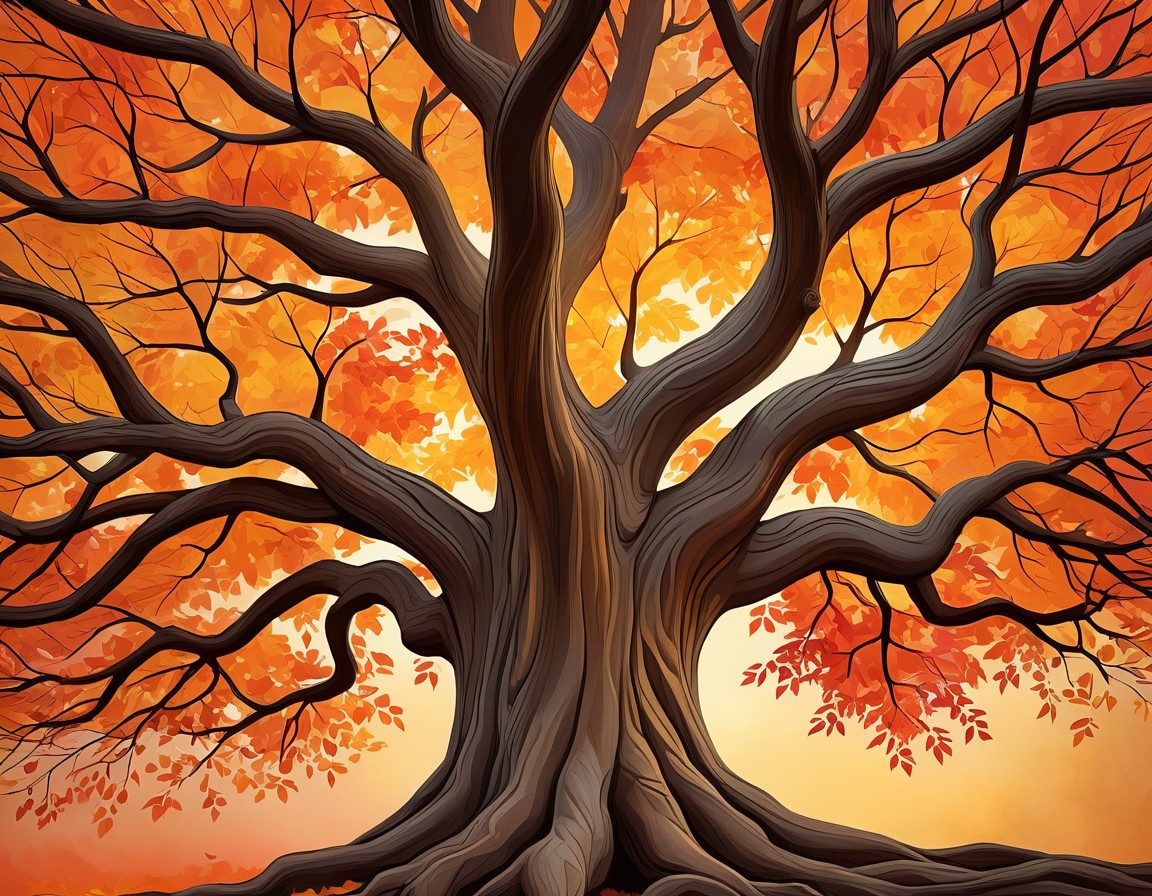 A majestic tree with intricate branches stretches wide, adorned with vibrant orange and red autumn leaves. The warm glow of light behind enhances its striking, natural beauty.
