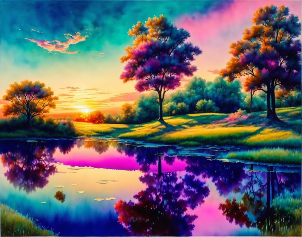 Vibrant sunset with fiery hues reflecting on a tranquil lake amid lush trees under a purple-tinted sky.
