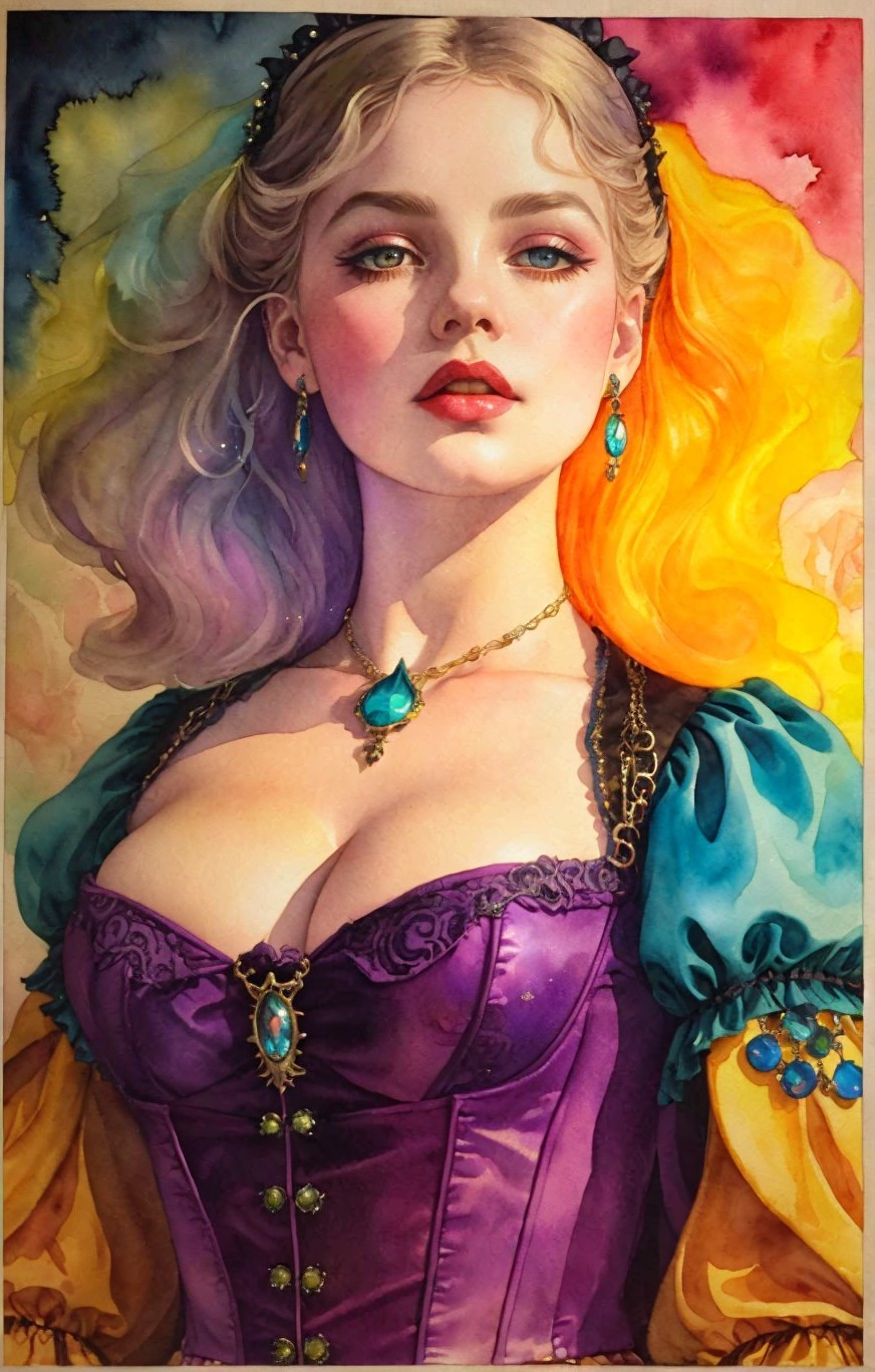 Juvenile enchantress, occult theme, mysterious baroque juvenile, wavery watercolor and ink style by William Bradley & Ho Baron, William Turner's lighting and contoured outlines, colorful surrounding, layered, buxom, delightful, handsome, gothical, adorned, joyful, greeble, non-figurative, asserted ectoplasmatic gushing, slightly dystopian ambiance, detailed face, refelctive crackles, dyed, baroque, brightness 1.9, iminal, quaint, cel-shaded style, Aliza Razell influence. Fantastical composition, flattened panels and intricate geometric facets. Emphasize blotted flares, sharply outlined contours, airbrush overspray, fine-line details, reflective surfaces with smooth yellow gradients, metallic-honey light-yellow, rosewood pink, achieving a lacquered sheen, stylized painting, high resolution, luminous plasticity. mip-mapping, phong shading, reflective mapping 1.3, dynamic lighting 1.3, vfx-inspired, LiDAR point cloud, zentangle reference, subsurface scattering, bloom-effect, hues in textured layers, painterly elements, glossy finish, HDR, blurred color schemes, raytraced shadows, divisionism techniques, luminism, sfumato-effect, dreamcatching, tall and lean details, quilling, watery thinned colors, glazing watercolor details, paint splatter, worn and rough surface, stippled, blotted, tesselated, debeh, bokeh, Haddon Sundblom hues, acrylic art techniques, oxidian hues, golden shadows, retrofuturistic flair, surrealistic vibe, contouring outlines by Ho Baron, vertical layout, emulsion lifts, whimsical gothic elements, ancient blurred background, angled, squiggly surreal splash art, 3 point lighting, glowing bioluminescent aura, liminal atmosphere, traumacore elements, overexposure. Suitability, appropriateness, accuracy, skills, shadow mapping, parallax occlusion techniques, smirky eye expression, extended organic-mechanical textures, wild hair, fusion of design and decay, with hints of what once was, creating an eerie yet captivating atmosphere. Mulit-layered eyes, hyper-realistic and expressive, convey a sense of ominous realism, avantgarde meets the surreal, oil paint.