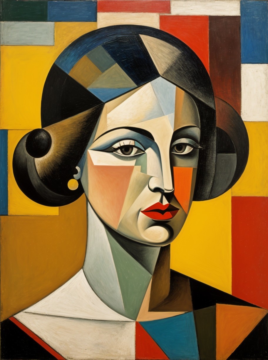 The image features a stylized portrait of a woman with geometric shapes and bold colors, showcasing a striking expression and a blend of modernist artistic elements.