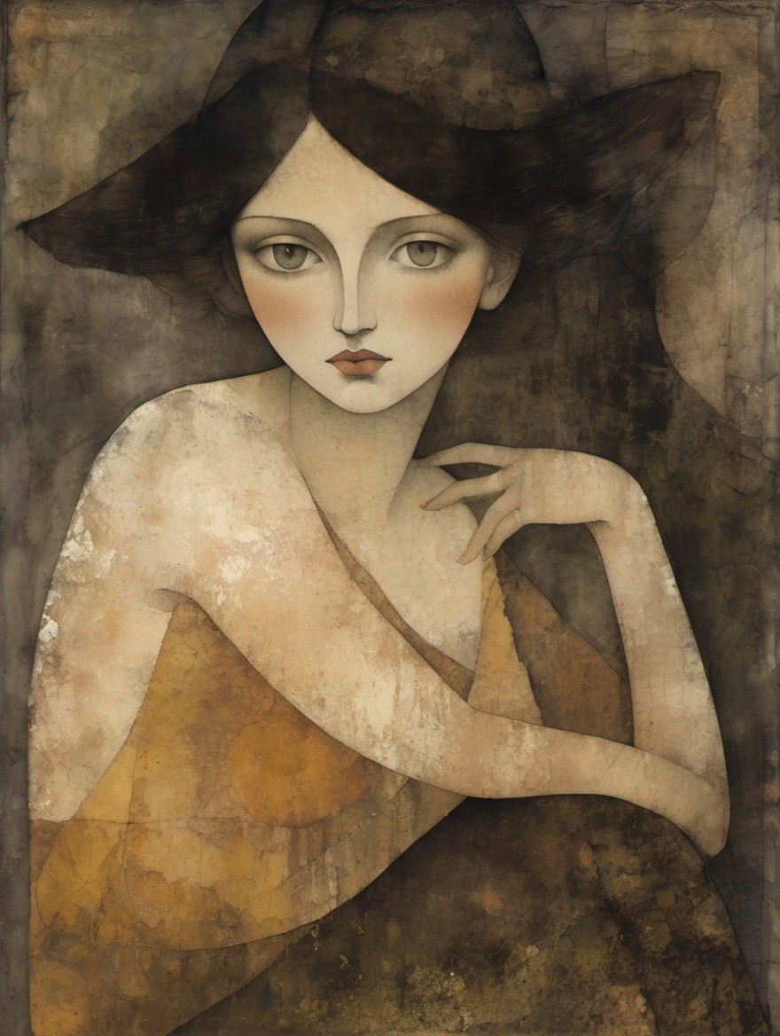 Beautiful woman, portrait in ochre, patina of ancient stone with moss, art brut, moody, somber, desaturated colors, in the style of Paul Klee, Arthur Rackham