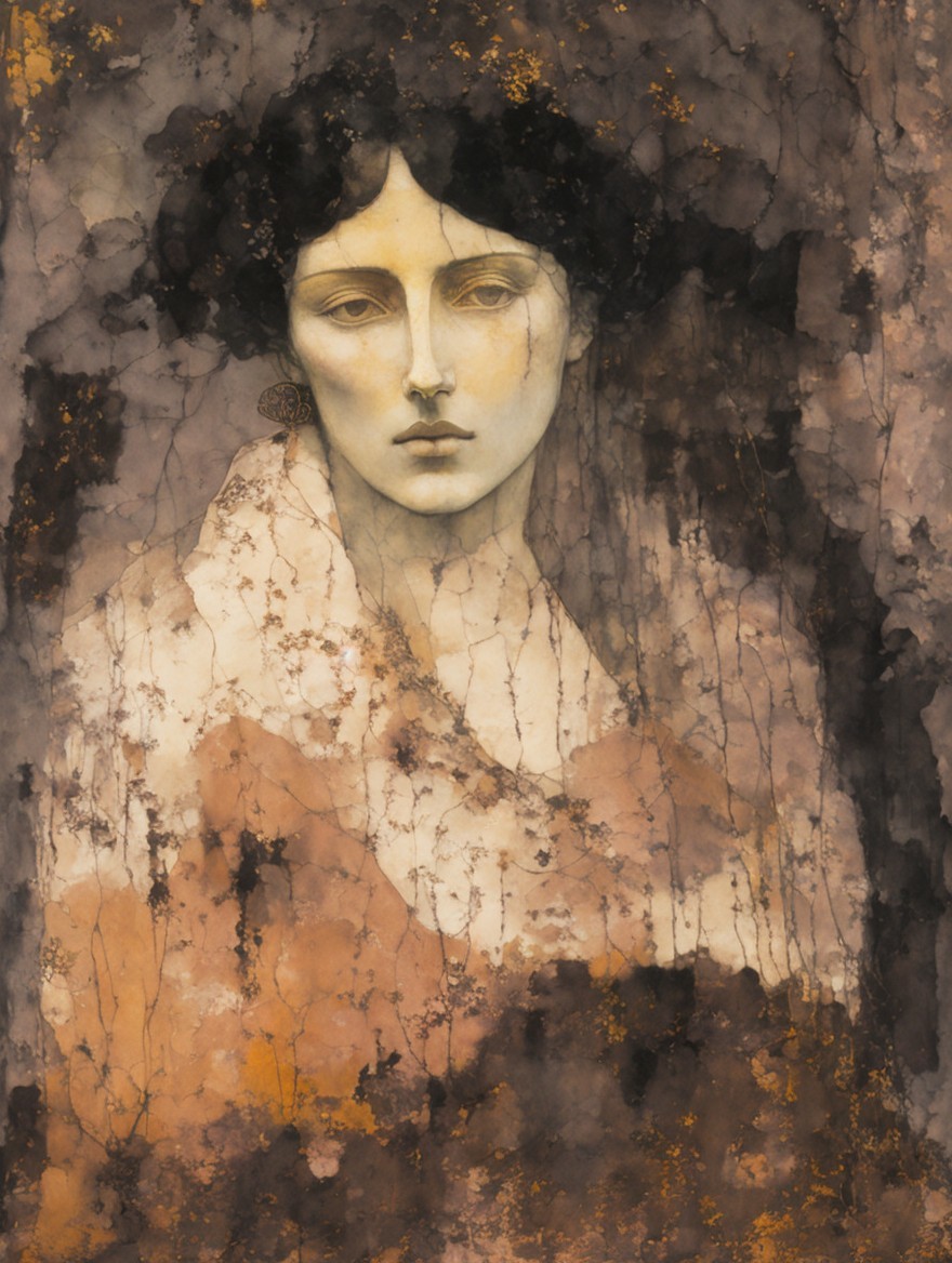 Prompt: "Beautiful woman, portrait in ochre, patina of ancient stone with moss, art brut, moody, somber, desaturated colors, in the style of Paul Klee, Arthur Rackham