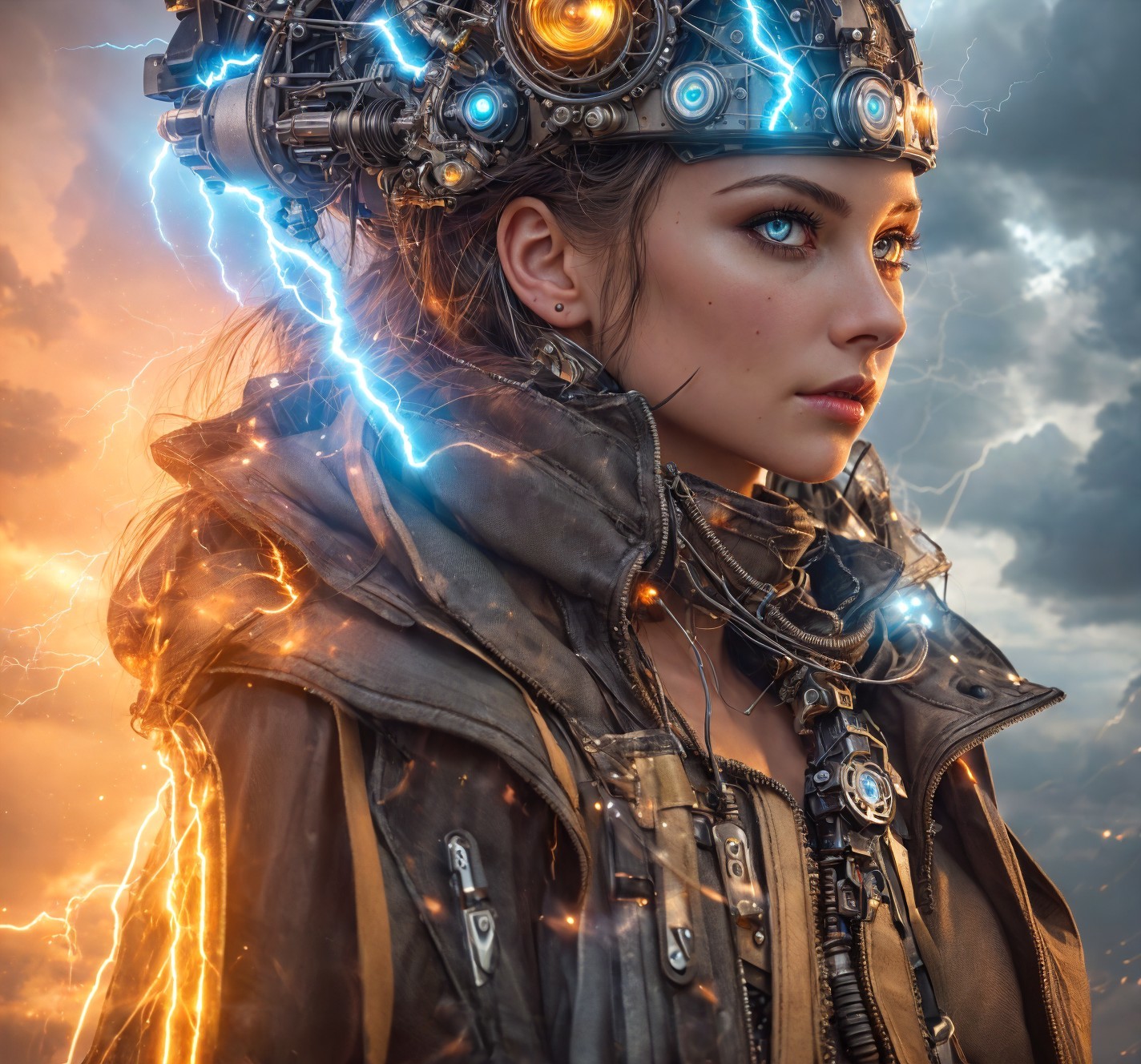 Beautiful Gaspunk Woman, Beautiful Eyes, Background with Clouds of Swirling White Smoke, Lightning Electrical Discharges, Hyper-Realistic, Hyper-Detailed, elegant,intricate, detailed, 3D Cinematic Lighting, Head Arms and Torso Anatomically Correct, symmetrical face, accurate anatomy and eyes, Bilaterally Symmetrical Body, High Voltage, Electrical Discharges around Head and Helmet with Torch Lights and Cameras, by H.R.Giger,Aleksi Briclot,Karol Bak,Greg Rutkowski.