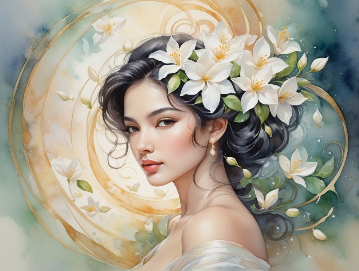 A serene portrait of a young woman adorned with white flowers in her dark, flowing hair. Soft, ethereal colors and floral elements create a dreamy background, exuding beauty and tranquility.
