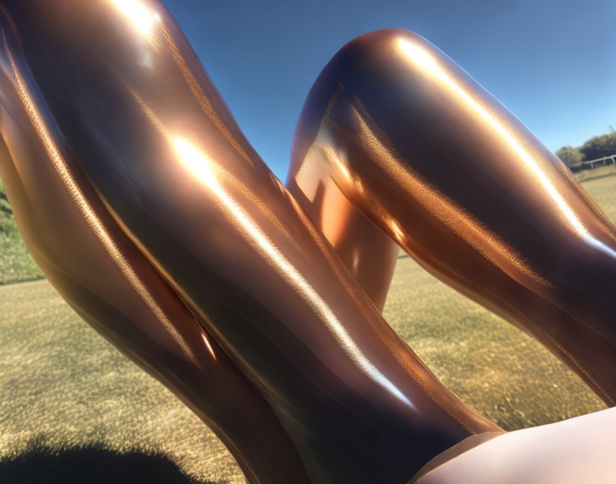A metallic humanoid figure is reclining with reflective surfaces, set against a backdrop of trees and a serene sky.