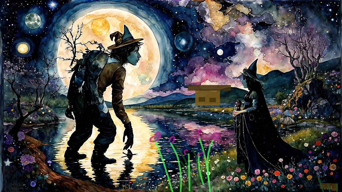 A mystical scene shows a tall figure in a hat wading through water, gazing at a young girl in a witch's cloak. They stand near a moonlit lake, surrounded by colorful flowers and planetary orbs.