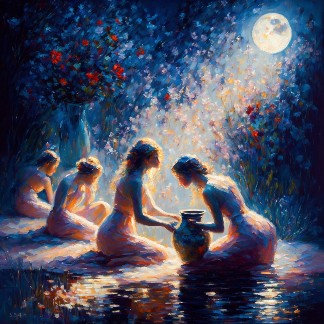 Four women in ethereal dresses gather by a serene waterside under moonlight, surrounded by blossoms, with luminous hues highlighting the scene.