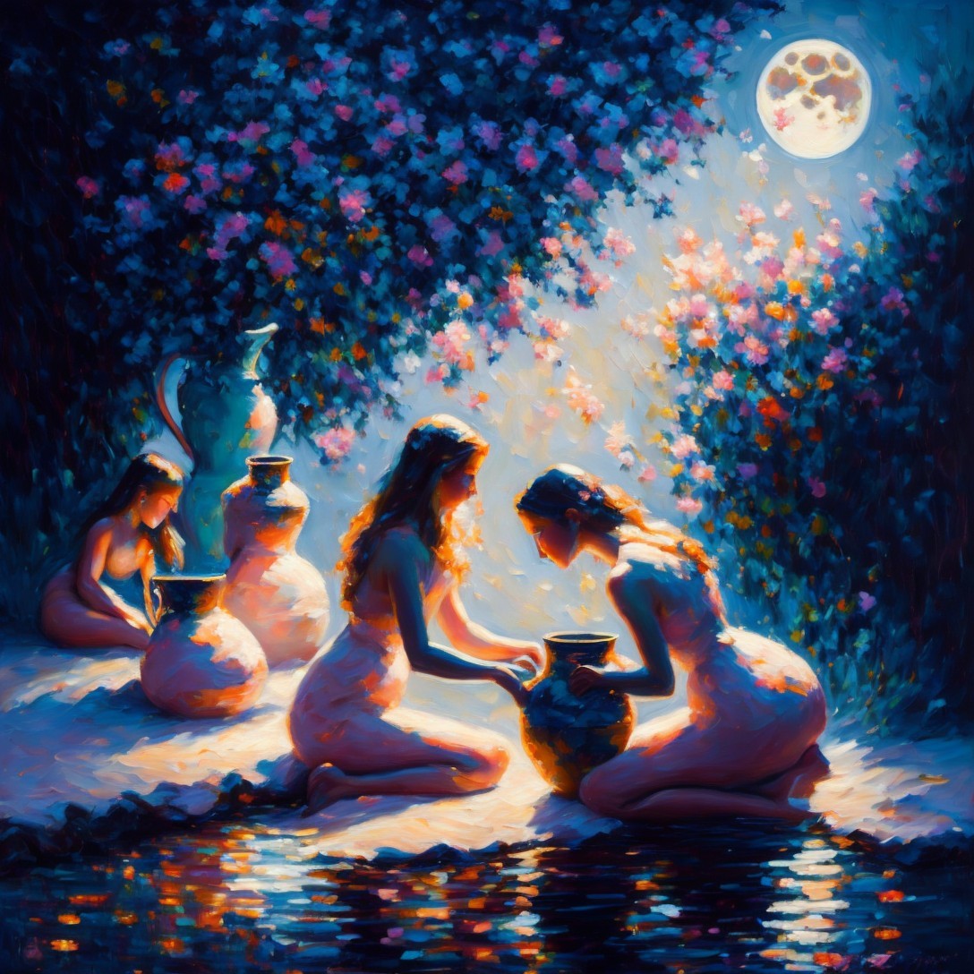 Prompt: beautiful girls, almost naked, wash themselves from a ceramic jug under the moonlight. Figurative impressionism, acrylic on canvas in the style of Oleksandra Chaldovych, impasto, expressive, muted palette, kneeling, by Satori Canton. she is a creator of light, densely packed light that mimics the contours and features of a woman's body, bioluminescent, translucent, cinematic, film light, side view, surreal hallucinatory with intricate details, shimmering light, suggestive, captivates viewers with beauty and mesmerism, hyper-detailed,hyperrealistic, masterpiece, atmospheric, high definition, vivid, transparent crimson, transparent amber, high contrast, dark corner, 8k, HDR, by Koos Roos