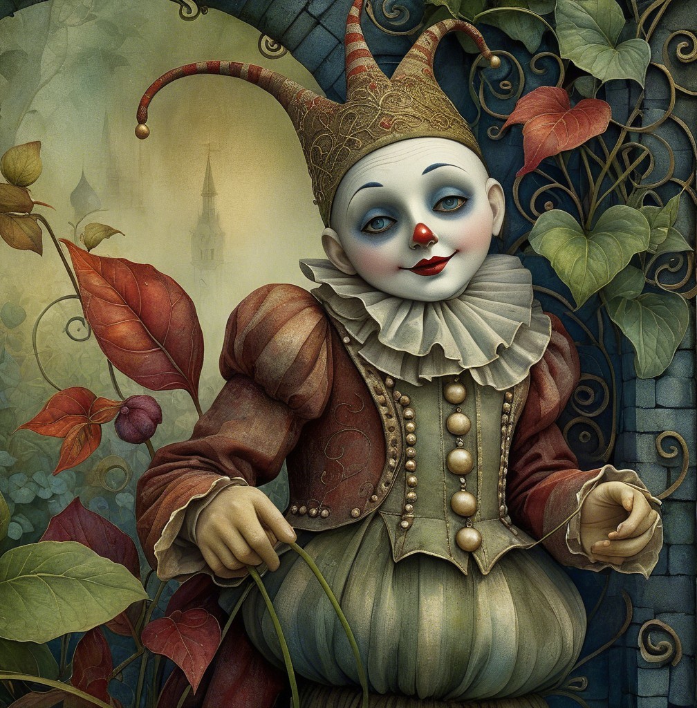 A whimsical clown with a painted face and traditional jester outfit stands amidst lush greenery and vibrant flowers, surrounded by delicate butterflies in a mystical garden.