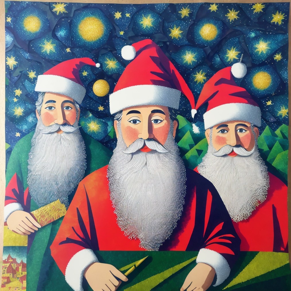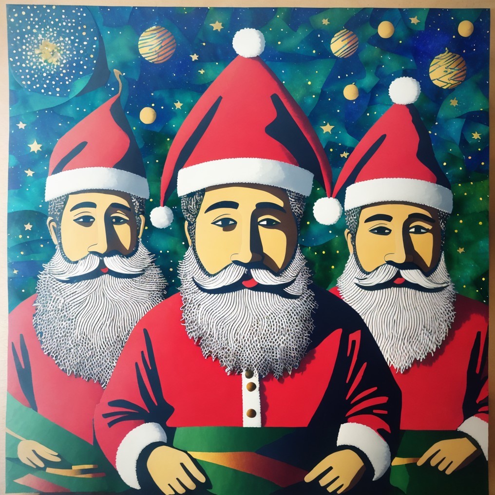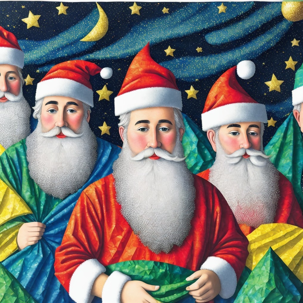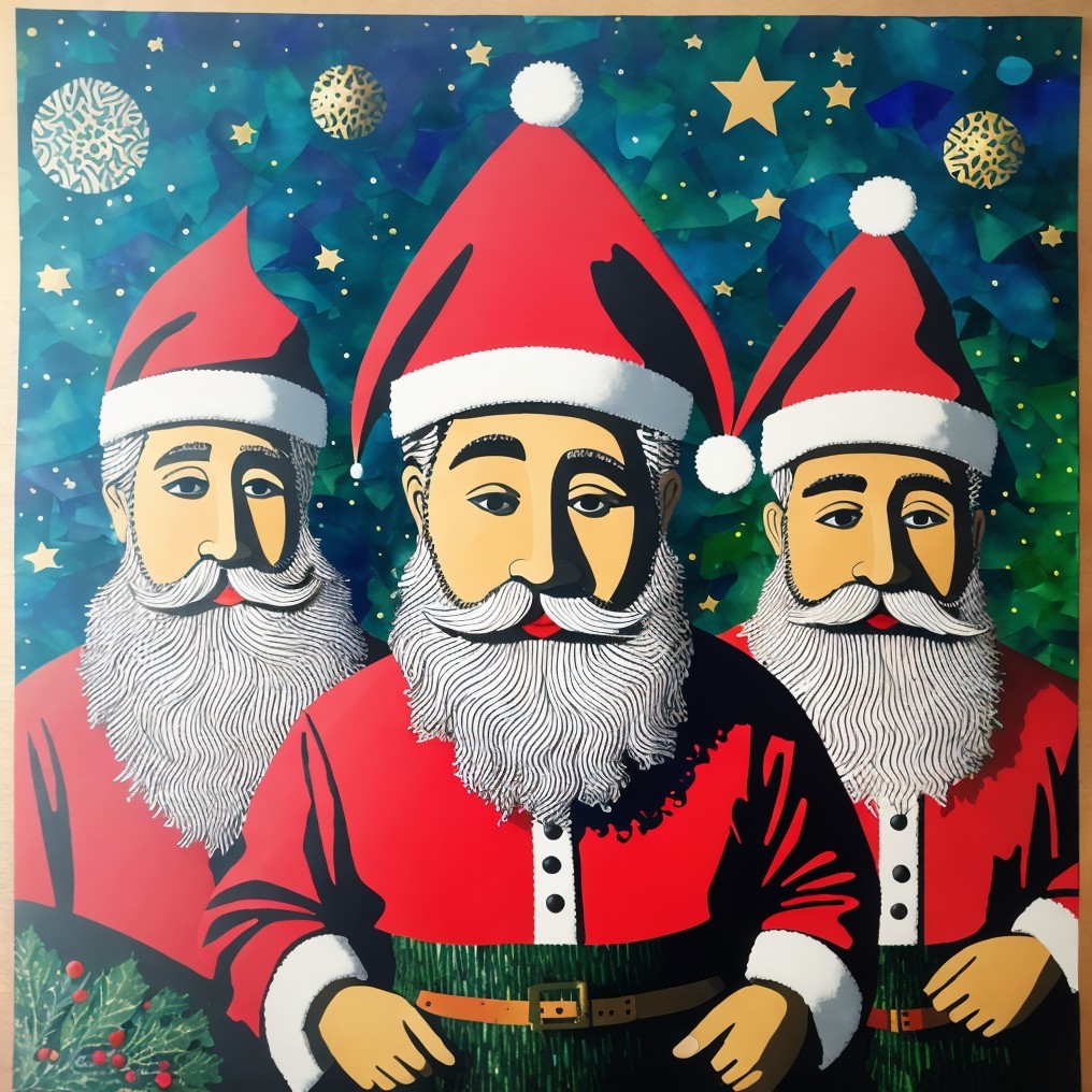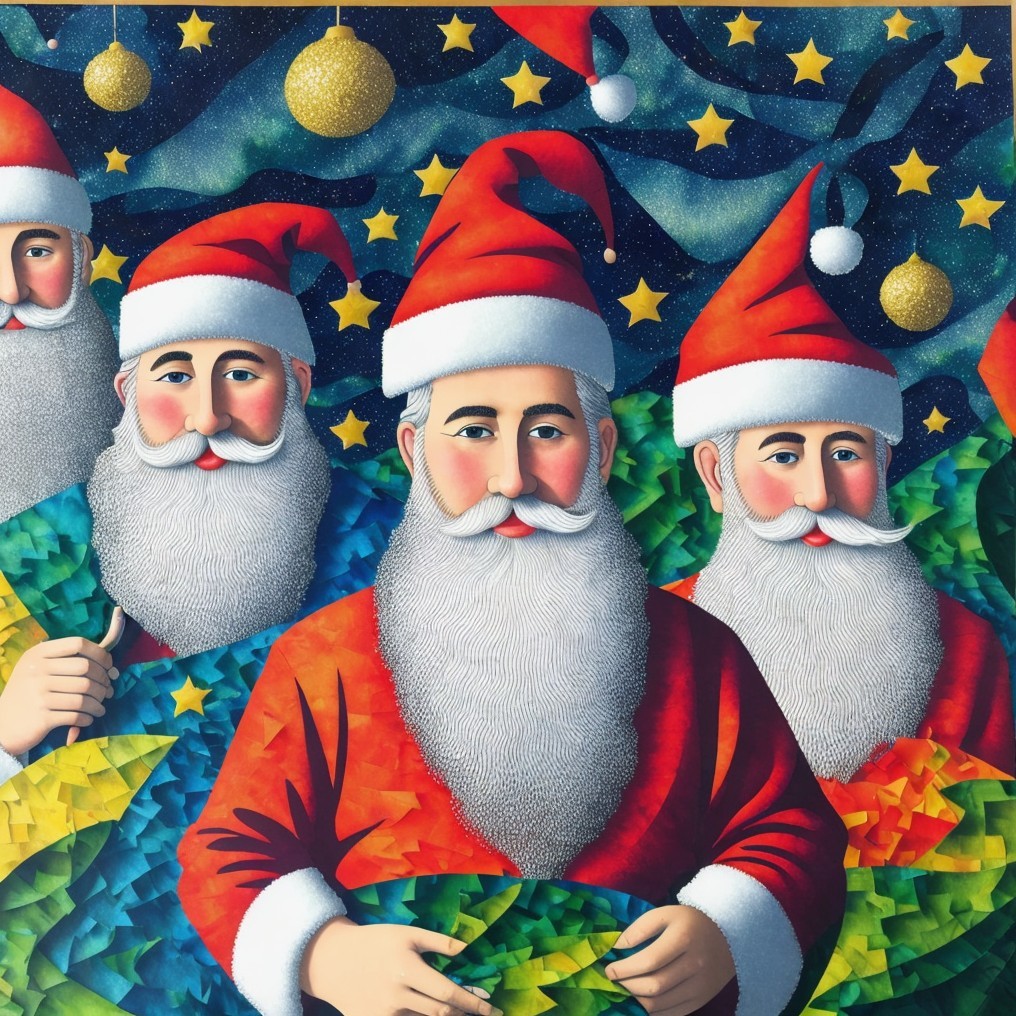 Bright Parade of Santas as a Tissue paper collage and alcohol ink with overpainted metallic highlights.