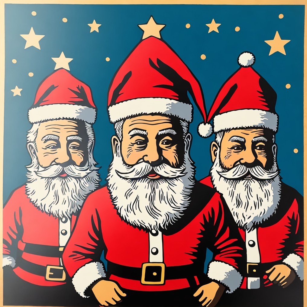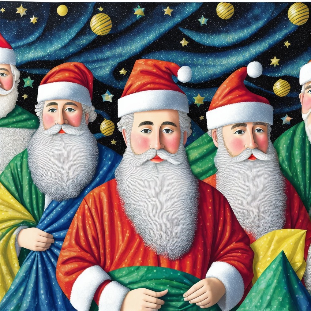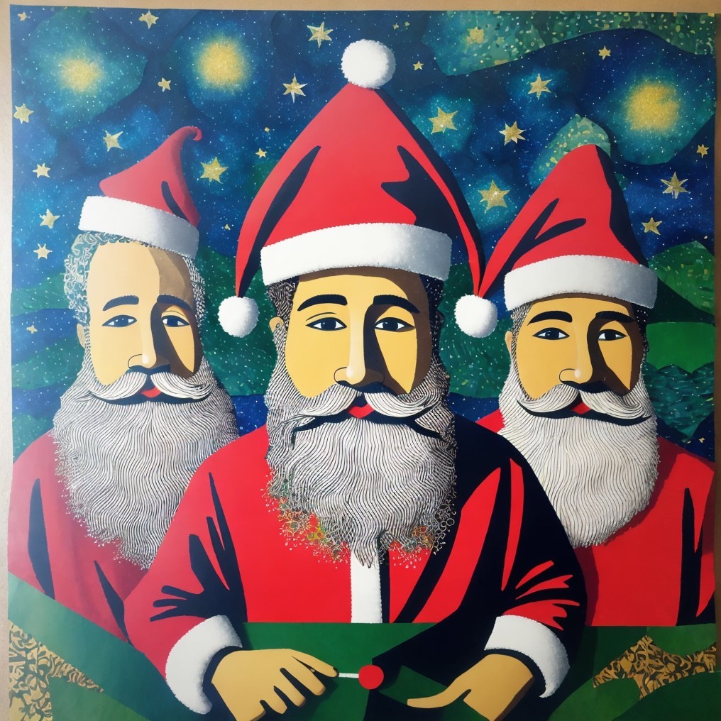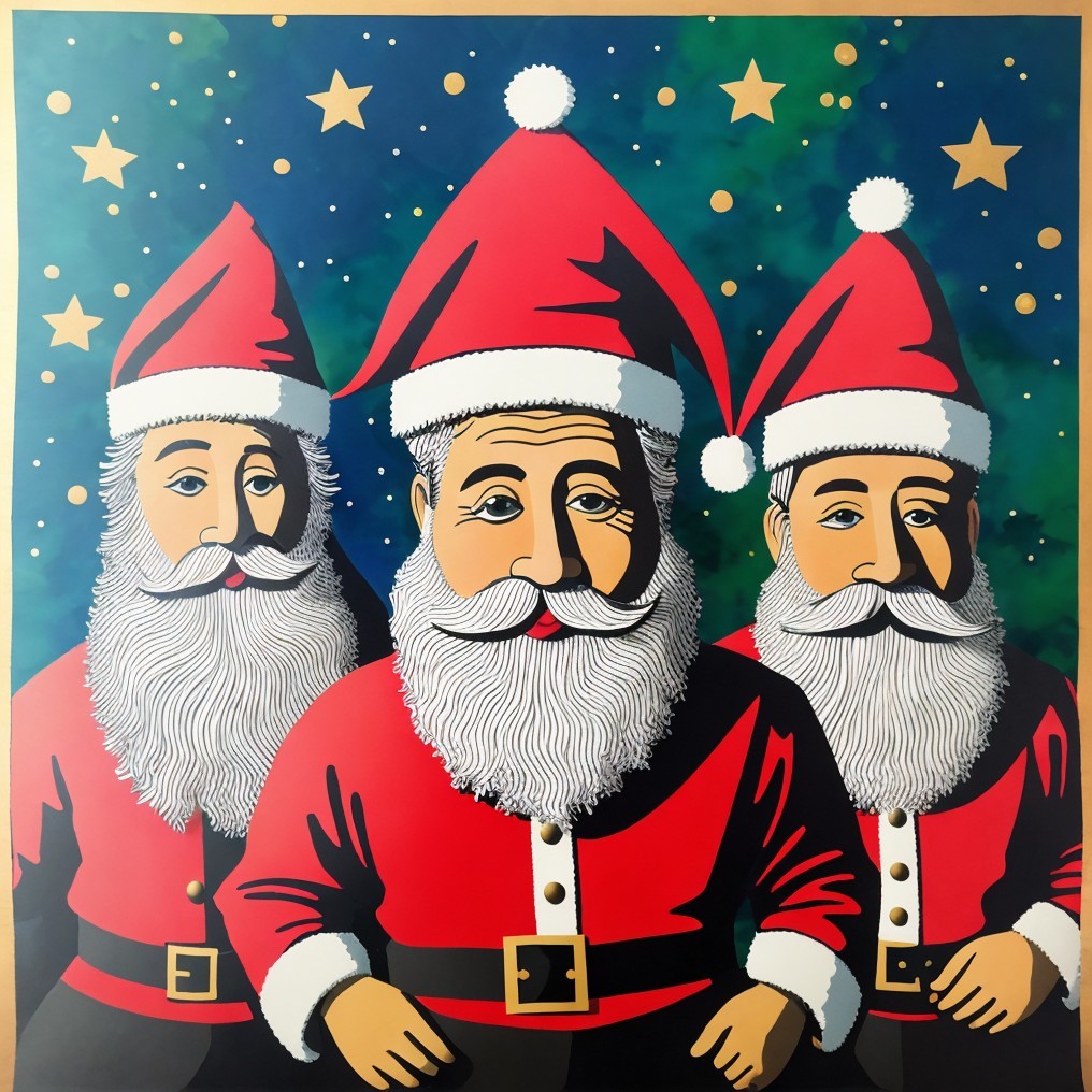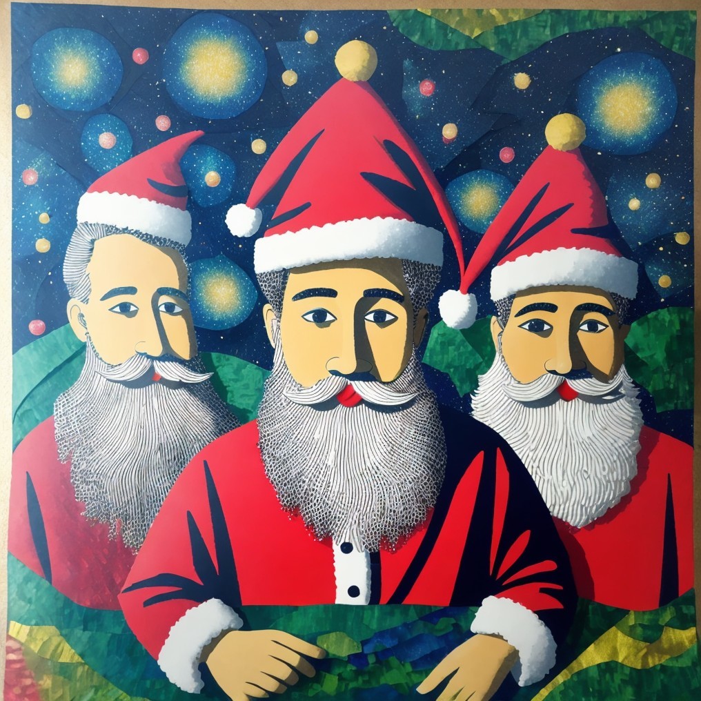 Bright Parade of Santas as a Tissue paper collage and alcohol ink with overpainted metallic highlights.