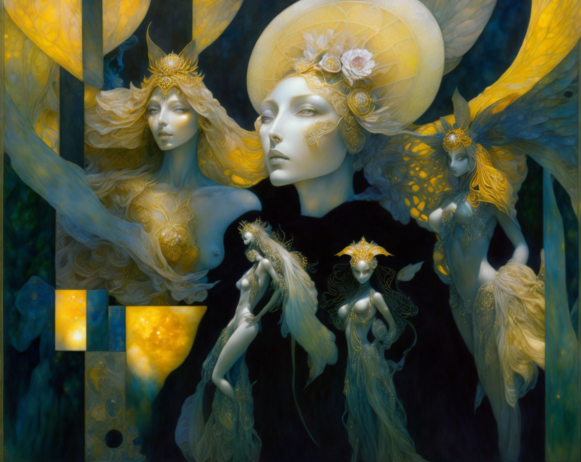 A surreal portrait of a woman with an intricate headdress, orb-like objects, and ethereal figures in a moody, blue-toned setting.