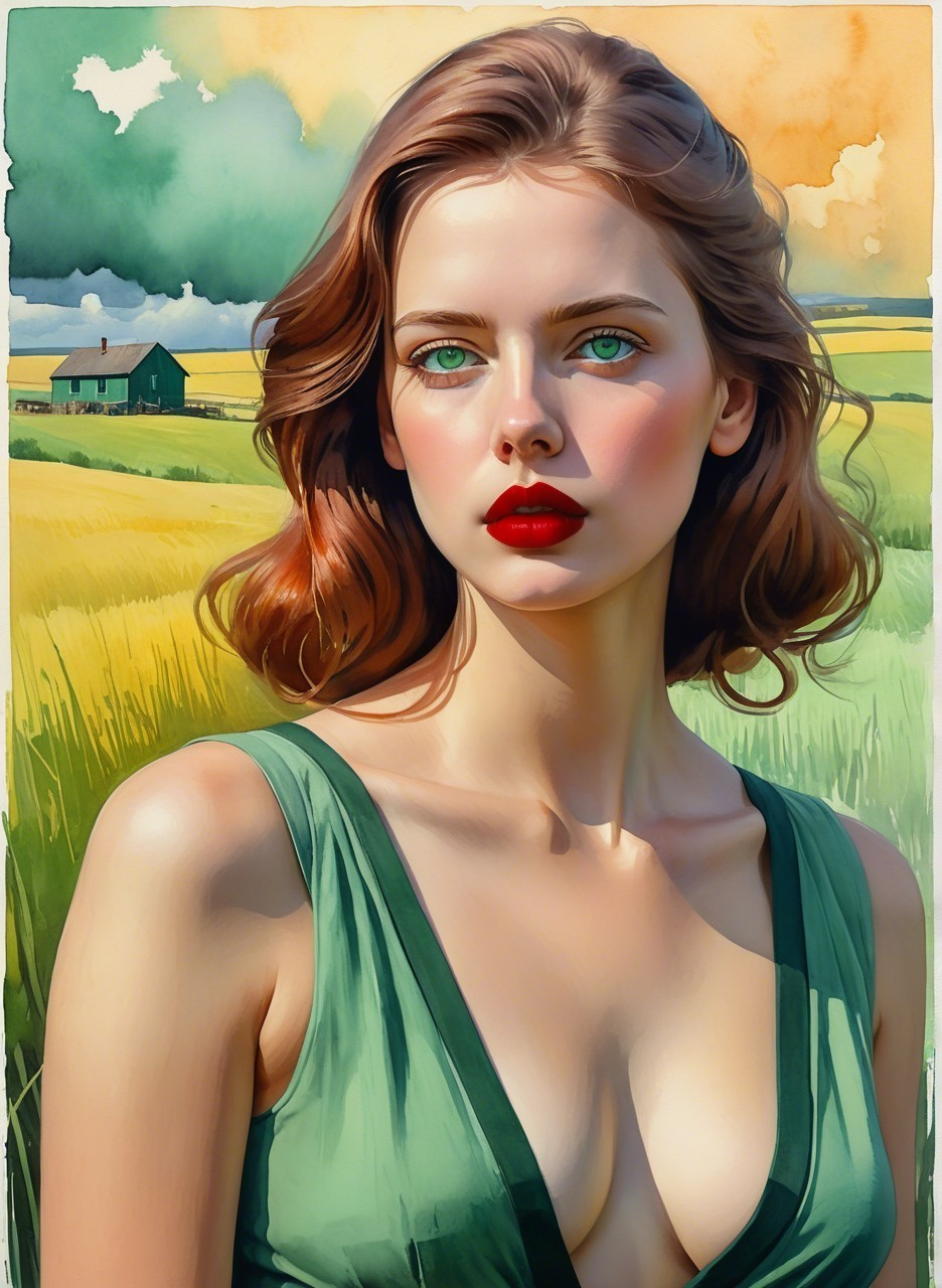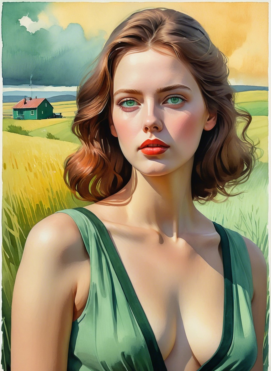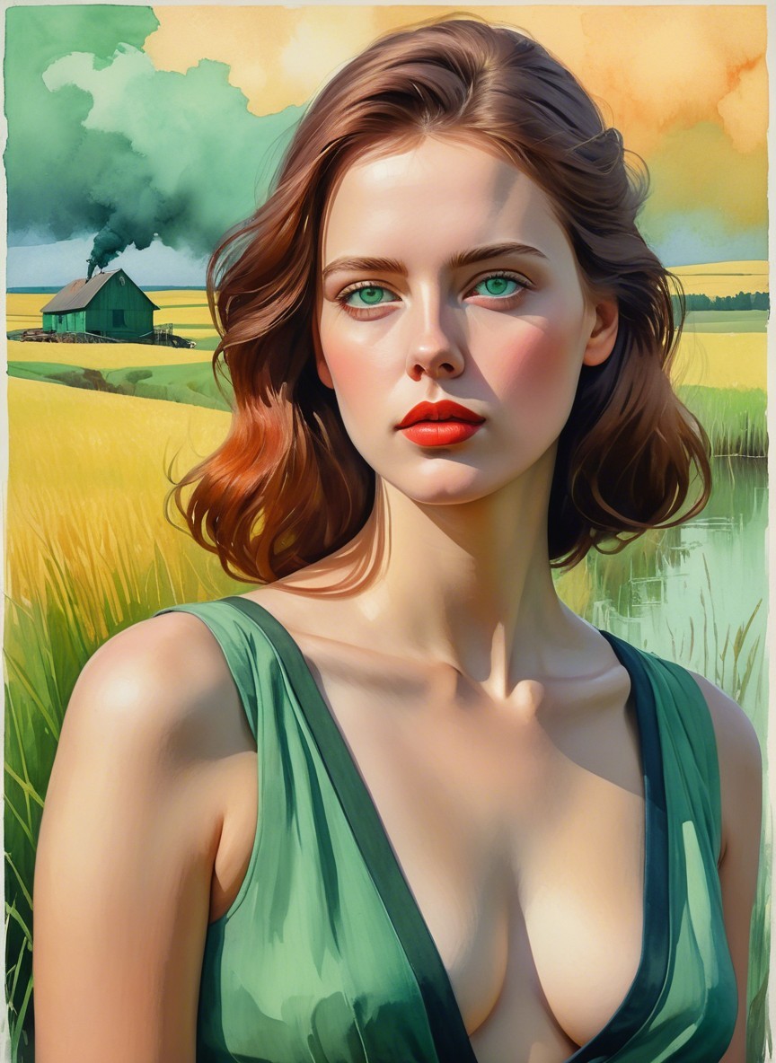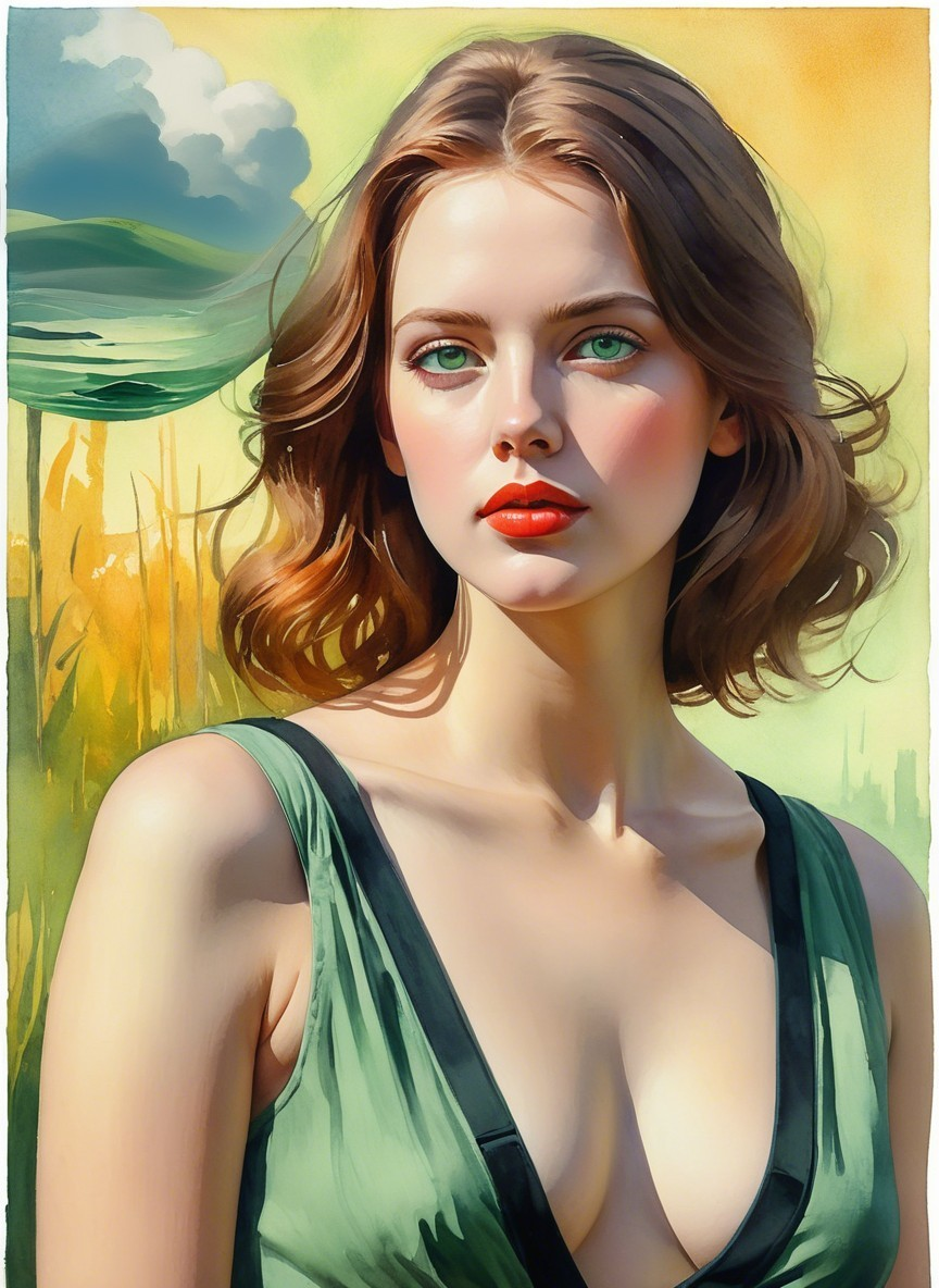 Prompt: vintage watercolor portrait in the style of oil paintings by Simon Stålenhag, embodiment by Ho Baron, hues by Yossi Kotler, coloring by Dee Nickerson, impasto, tetradic color scheme light-yellow sea-green dark-yellow light-blue, surreal dreamscape portrait, stylized, smooth, subtle, facial features and beautiful green eyes, mysticism, imaginative, soft coloring, dethereal, atmospheric, raytraced shadows, great depth and scale, overall composition by Stan Lee, fine contouring lines, moving, wide perspective, only curves, 3 point lighting, balanced coloring, abstract post-avantgarde, dreamy dystopian portraiture, watercolor overspray technique, slightly exaggerated features, sculpted, flowing hair illusion, ethereal atmosphere, fabric, luminism, plasticity 1.6, dynamic lighting effects by Sam Toft, J. E. H. MacDonald, turbulent flares, artwork inspired by Frank Frazetta, naturalism theme, octane render illustration, luminosity 1.3, brightness 1.3, geometrical, dyed, cel-shaded orphism featuring geometrical 3D effects, nuanced, romantic abstraction by Frank Frazetta, dyed textures, ambient occlusion 1.7, dappled lighting, rim brightness, serene, joyful, awesome stylized female, slightly angled side view, close up, transpositional invisible aperture, 1970s comic art heroine, 3d effects, casted shadows, portraiture art, fusion of foampunk and fantasy elements, inspired by Tara Donovan and William Bradley's styles, soft watercolor washes, vivid coloring, high contrast, softened lighting, great depth and scale, american gothic 1.7, rim lighting, impossible light transitions, divisionism, sculpted ensuring perfect symmetry and intricate visual cohorence,