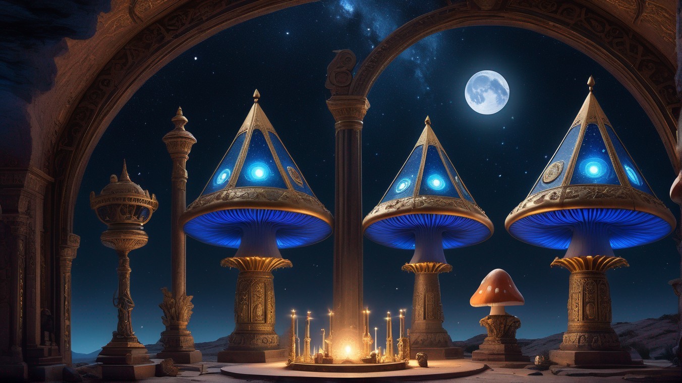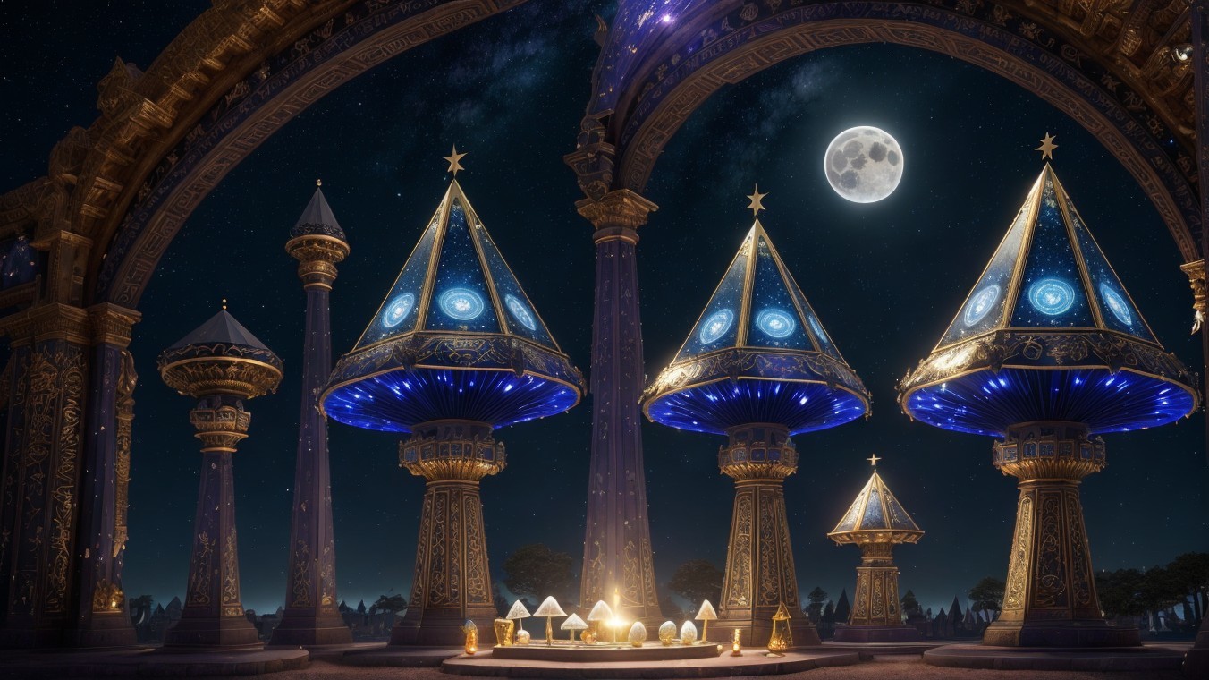 Illuminated blue jellyfish-like structures under a starry sky with a full moon, viewed through an ornate archway, evoke a magical, enchanting atmosphere.