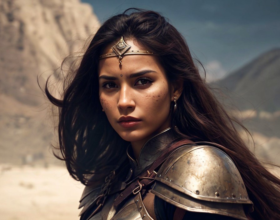 Dark-haired woman in headpiece and armor gazes in desert setting