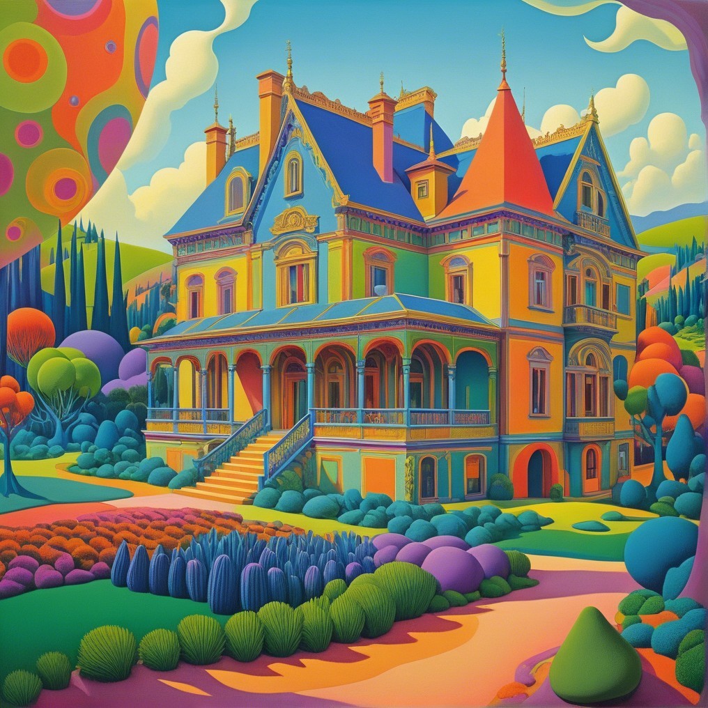 A vibrant, whimsical mansion features bright colors and intricate architecture, surrounded by lush, abstract landscapes of rolling hills and stylized trees, creating a surreal, dreamlike atmosphere.