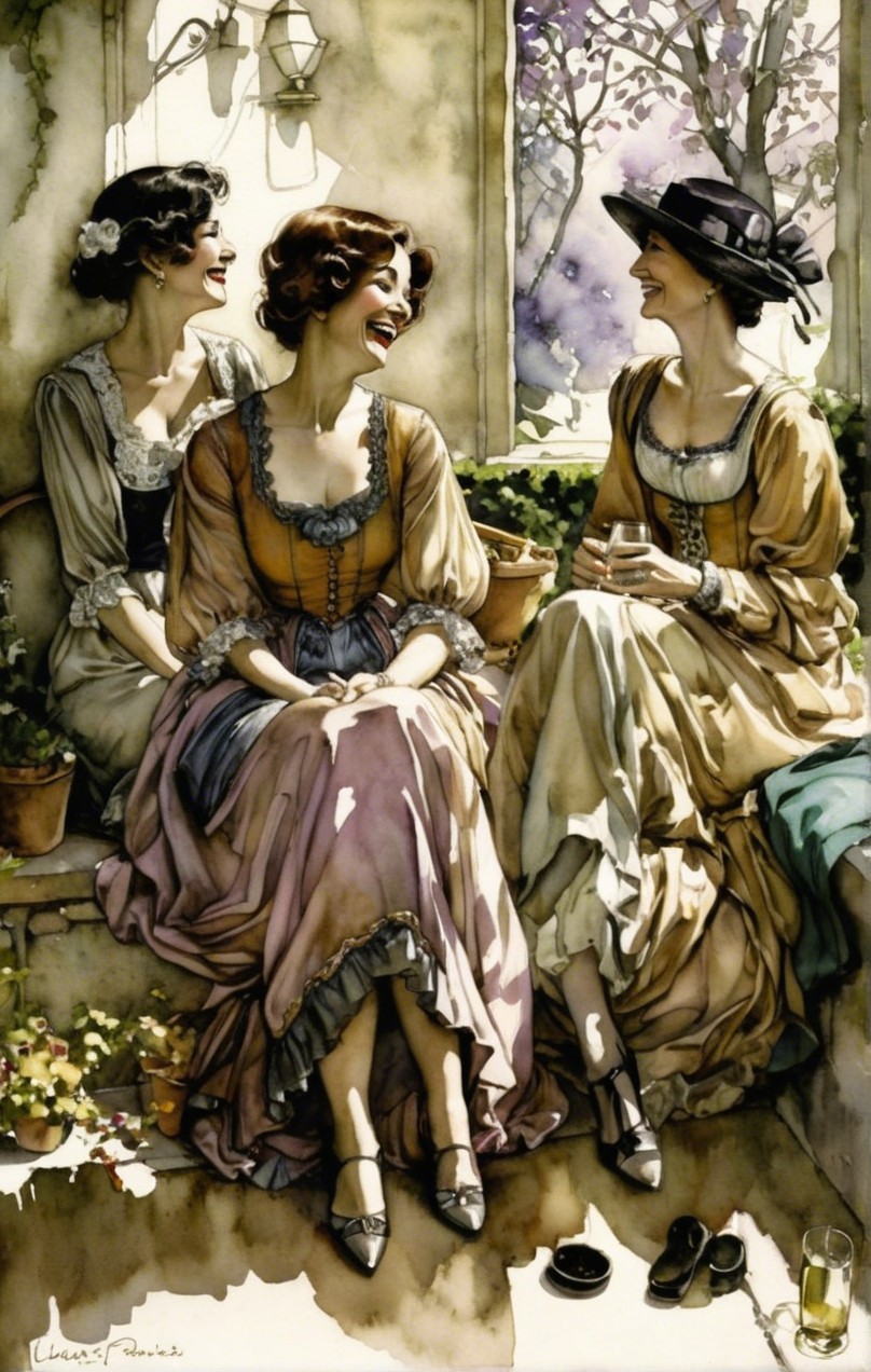Three elegantly dressed women in vintage attire share laughter and drinks in a sunlit garden, surrounded by greenery, embodying joy and camaraderie in a charming outdoor setting.