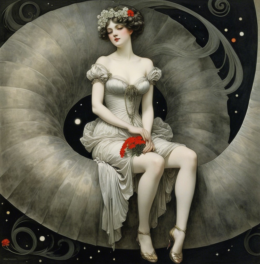 A graceful woman dances against a dark background, adorned with flowing white fabric and vibrant flowers. She stands on a crescent moon, embodying elegance and ethereal beauty.