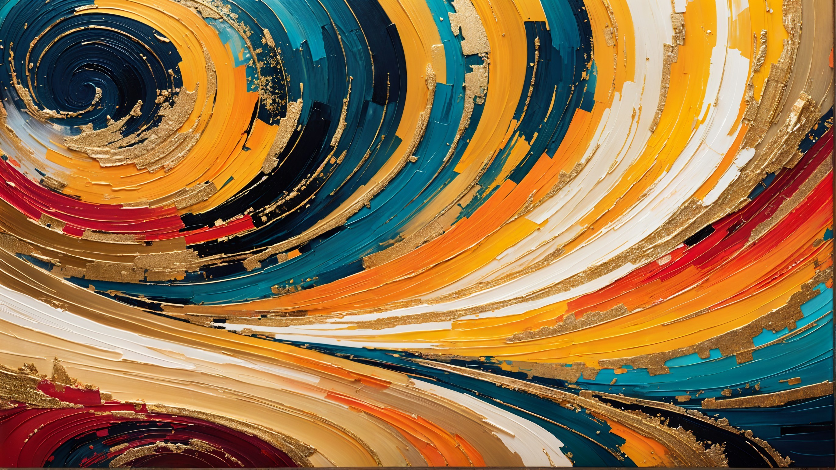 An abstract cityscape showcases vibrant, swirling colors that evoke energy and motion, with iconic skyscrapers silhouetted against a dark blue sky, blending warm and cool tones.