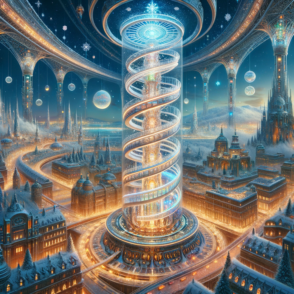 A futuristic cityscape adorned with sparkling lights and snow, featuring a glowing spiral tower at its center, surrounded by elegant structures and a magical, ethereal atmosphere.