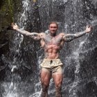 A muscular man stands in a rocky cave, chained, with arms outstretched in a dramatic pose. He appears to be expressing a strong emotion, possibly struggle or desperation. Bright light filters in.