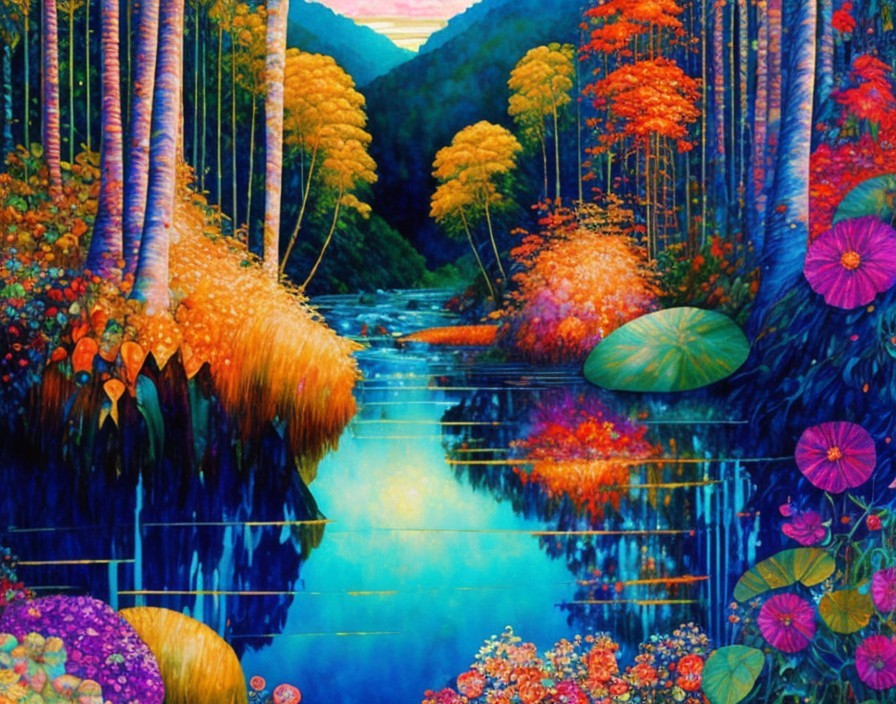 Prompt: 3D watercolor patchwork, fantastic Wide view, in the very best style of Gustav Klimt, a spectacular sunrise reflected in a beautiful rainforest river, satiny, high quality, shimmering, elegant, with vibrant saturated colors, elegant, highly detailed, glistening magic style, by Alphonse Mucha