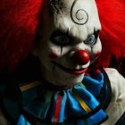 A close-up of a sinister clown with striking red hair, bold blue and white face paint, and a red nose. The clown wears a dramatic, ruffled costume, creating an eerie, unsettling atmosphere.