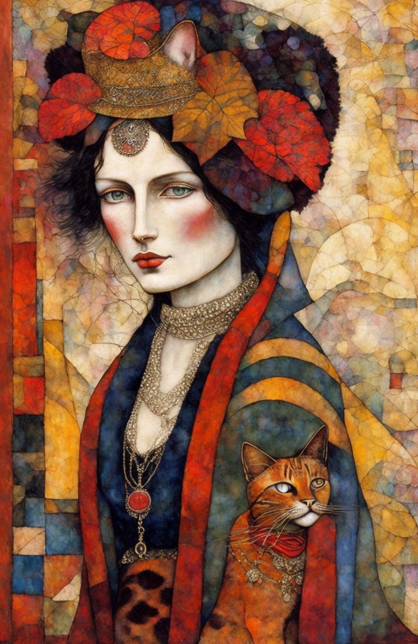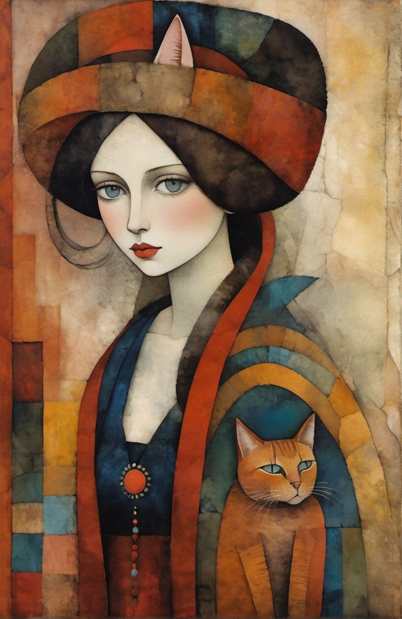 Beautiful woman with a cat hat, portrait in sienna, patina of ancient stone with moss, art brut, moody, somber, desaturated colors, in the style of Paul Klee, Arthur Rackham