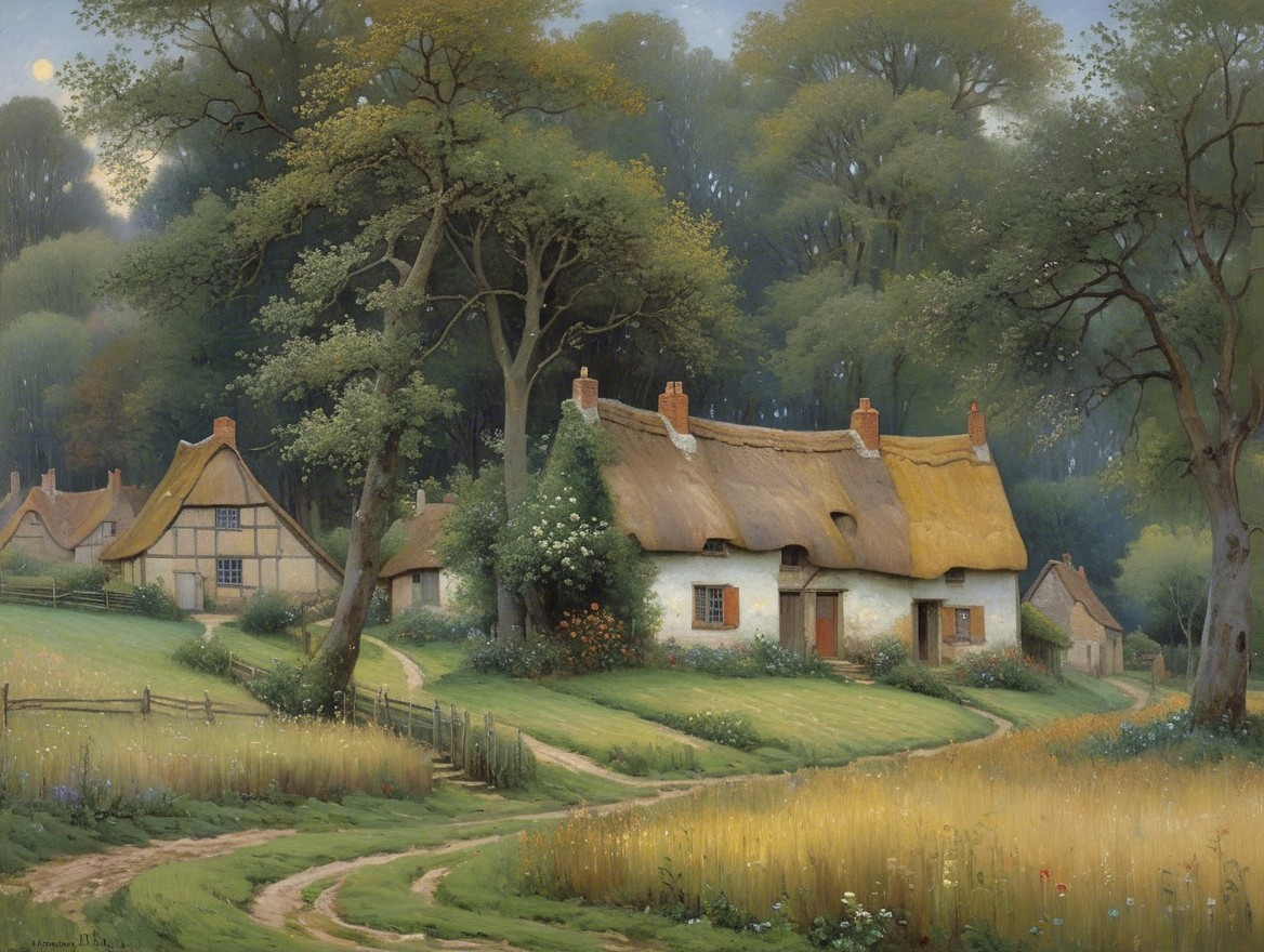 A picturesque rural scene featuring two women walking along a winding path, surrounded by lush greenery and charming thatched-roof cottages under a serene sky.