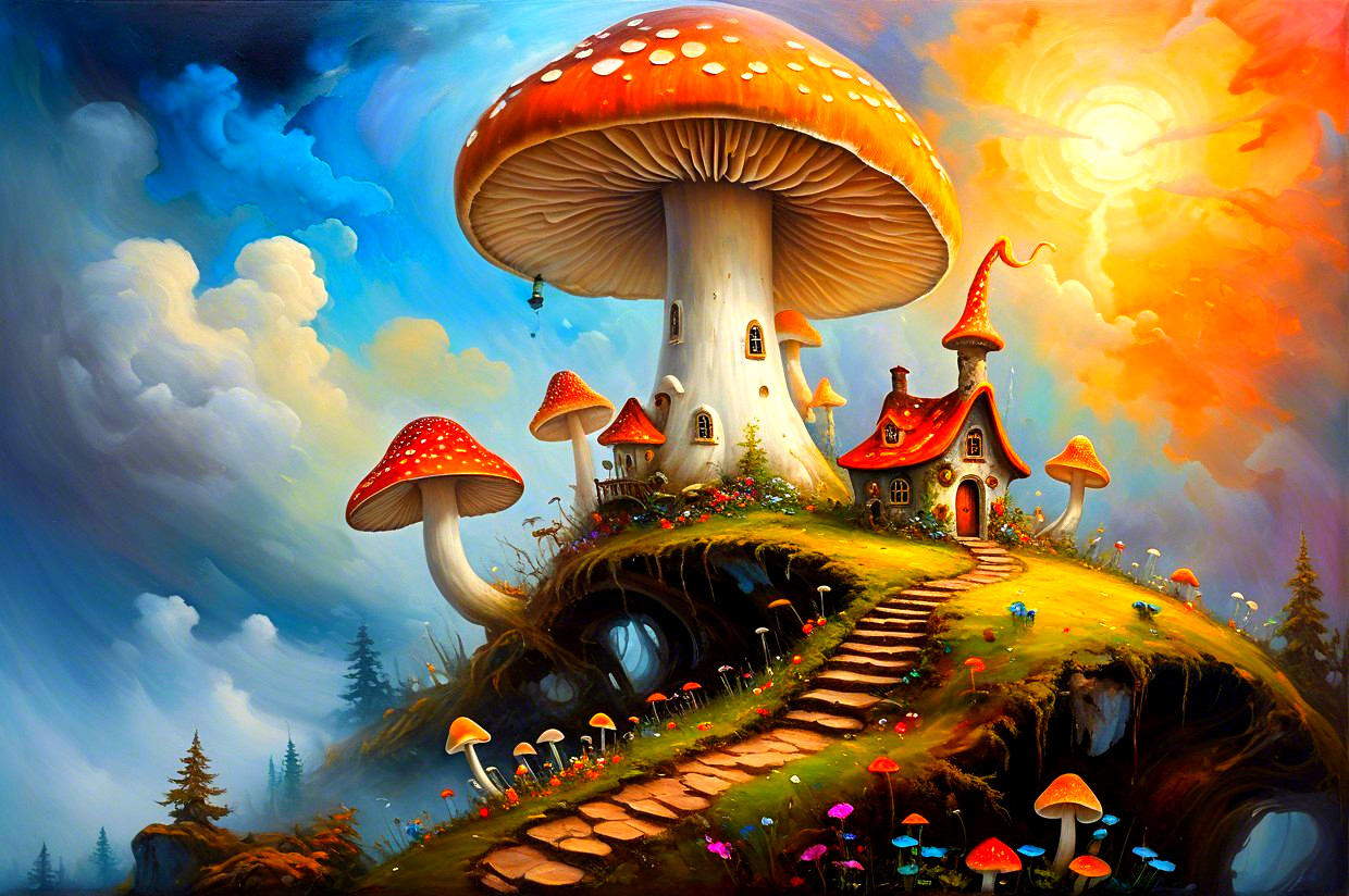 A whimsical landscape featuring a large, vibrant mushroom house surrounded by smaller mushrooms and colorful flowers, under a bright sky with fluffy clouds and a warm sun setting in the background.