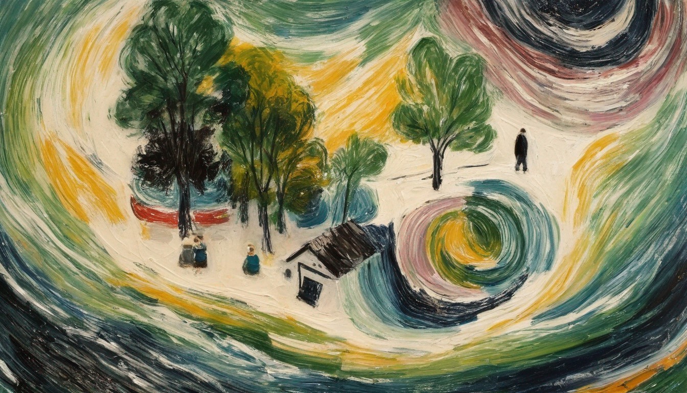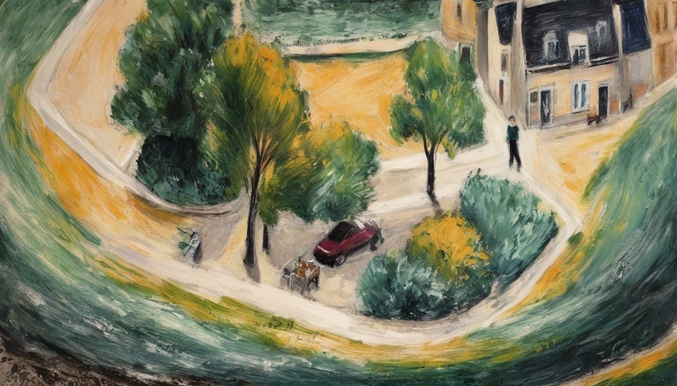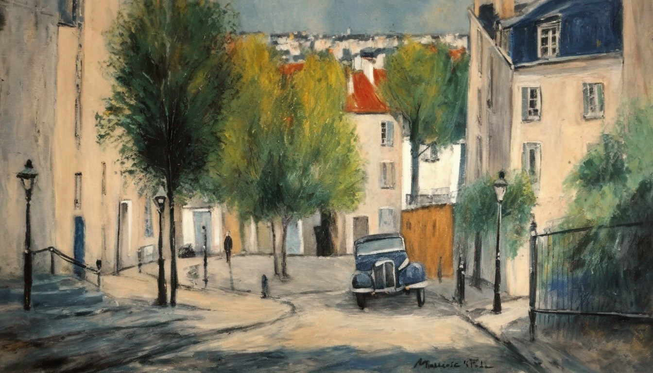 A serene painting of a vintage car on a leafy street with old buildings under a soft sky.