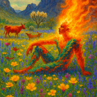 Surreal Landscape with Fiery Figure and Vibrant Flowers