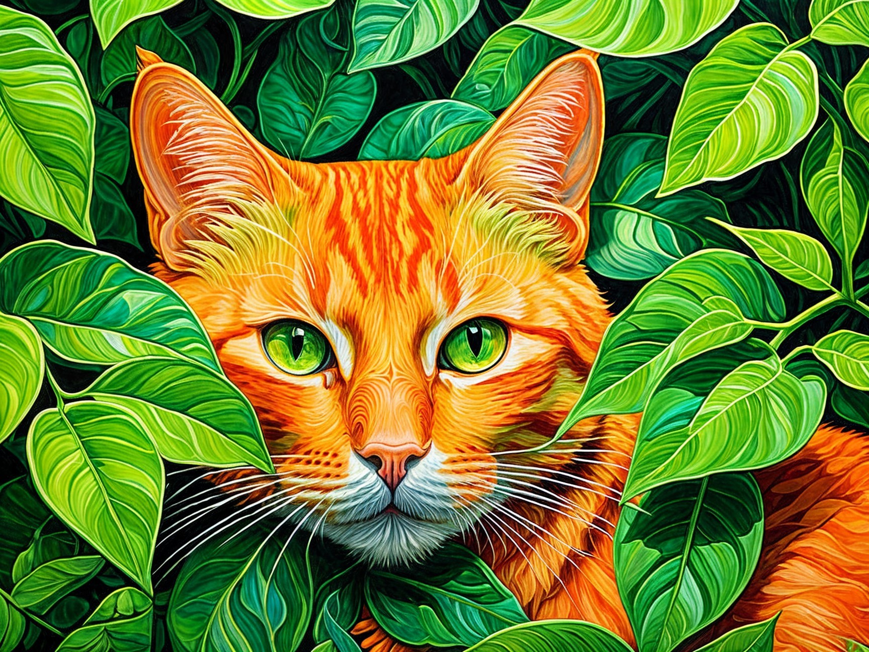 A vibrant orange cat peeks through lush green and gray leaves, blending beautifully with its surroundings while its striking green eyes capture attention. The details are rich and lifelike.
