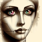 A striking portrait of a woman with vivid green eyes and an ethereal expression. Her face features artistic makeup with bold lines and drips, creating a surreal and captivating appearance.