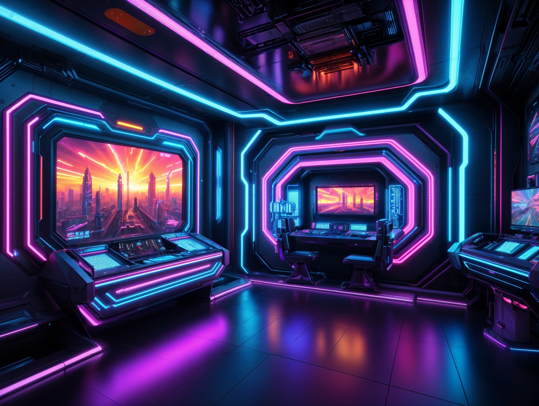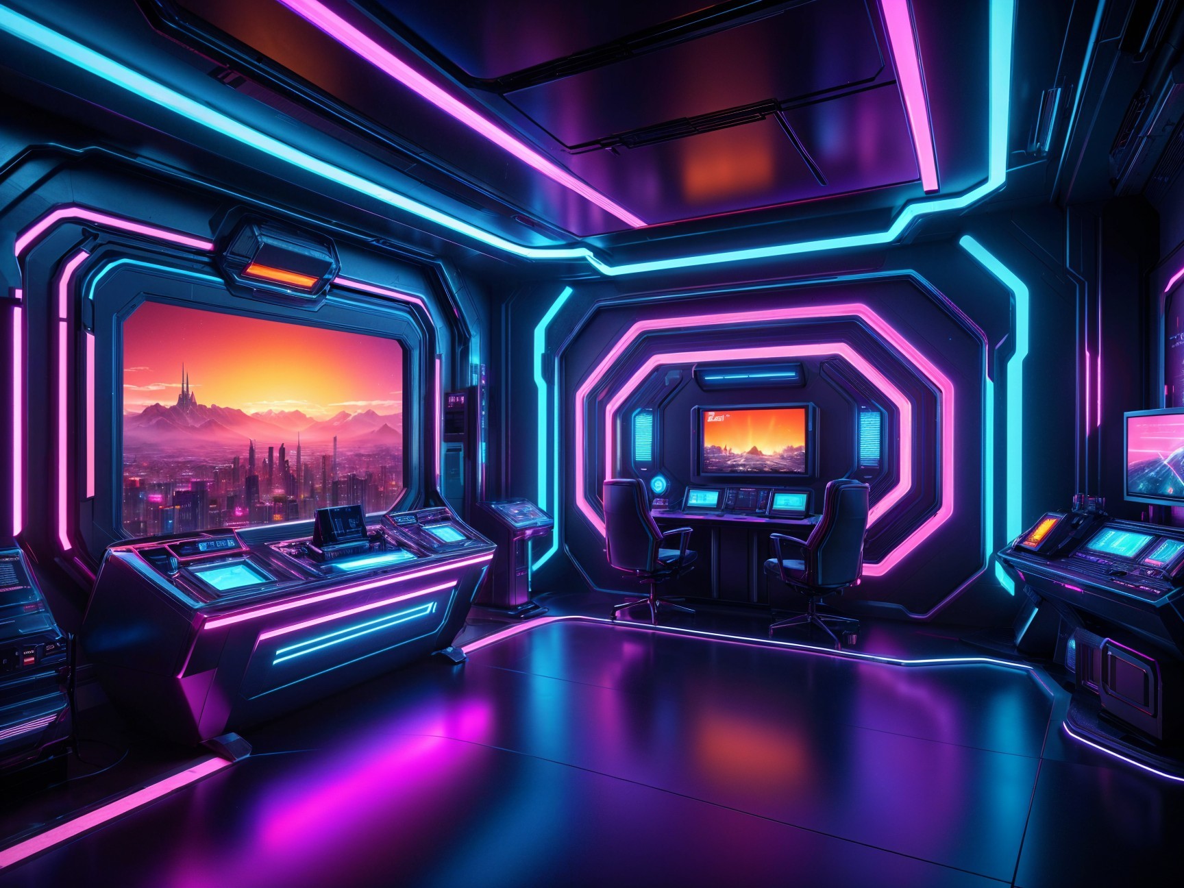 A futuristic room bathed in neon lights, featuring sleek consoles and large windows showcasing a vibrant cityscape at sunset. The design blends high-tech elements with a sci-fi aesthetic.