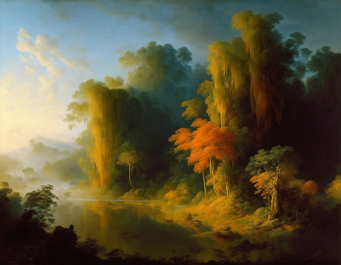 Prompt: "Oil on canvas, wide angle view, majestic mist sunrise at a deep valley on Amazon rainforest at spring, glowing with vibrant hues. Perfect composition. By Rembrandt van Rijn. By Jacob van Ruisdael. By Meindert Hobbema. By Jan van Goyen. By Aelbert Cuyp. By Jan Both."