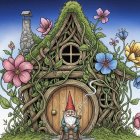 Full body shot, an old gnome with a white beard wearing a red hat, a light blue shirt, brown pants and shoes is sitting on a small wooden stool smoking a pipe, in front of his house covered in vines, moss and various colorful flowers, including big pink blossoms.