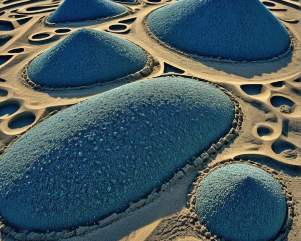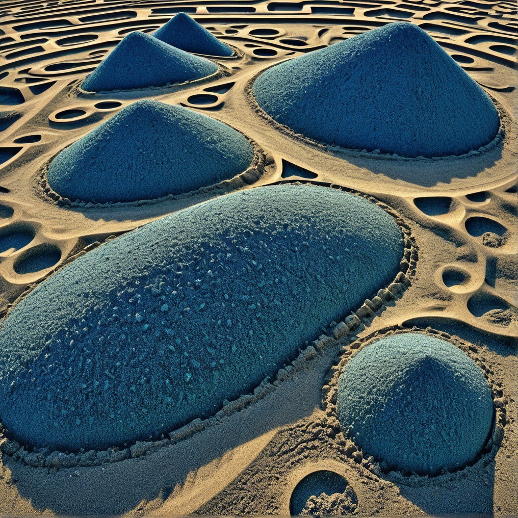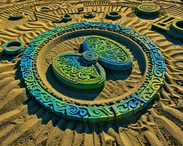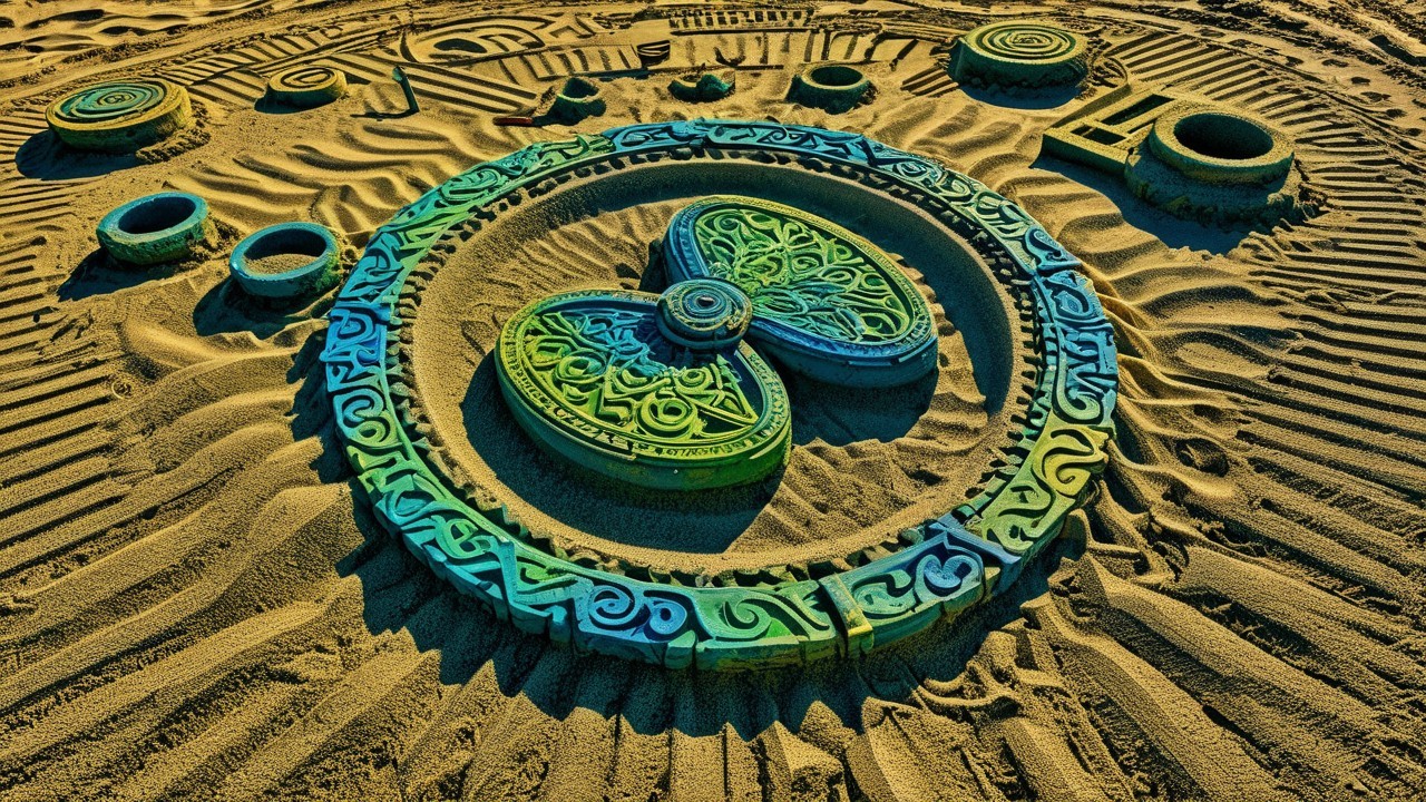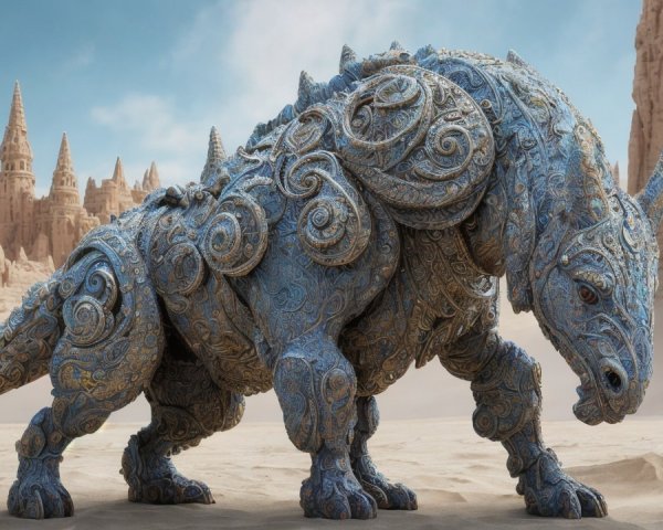 A fantastical creature resembling a rhinoceros, intricately designed with swirling blue patterns, stands prominently in a sandy landscape filled with ornate, castle-like structures in the background.
