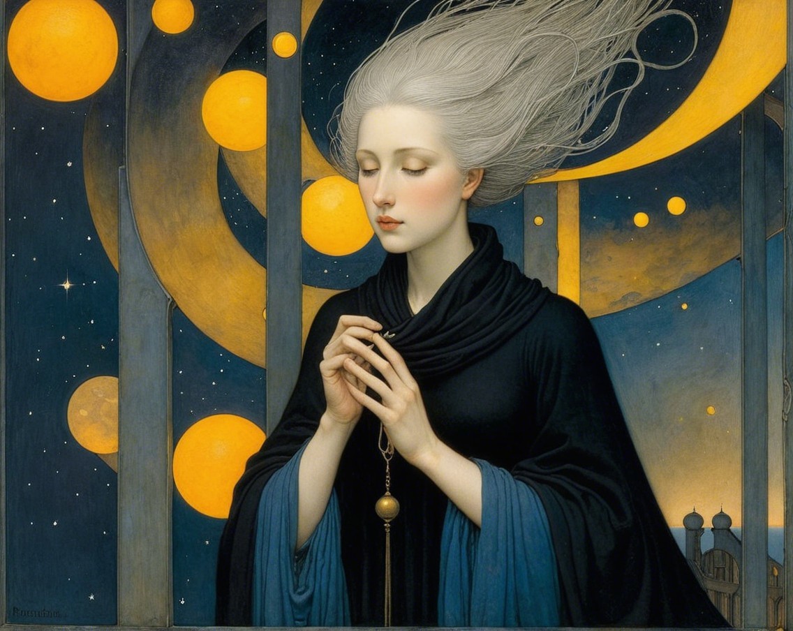 A serene woman with flowing silver hair, dressed in a dark robe, stands against a deep blue background. Golden orbs and a crescent moon illuminate the night, while bare trees frame the scene.