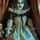 A striking figure in a vintage-inspired gown with dramatic puffed sleeves and lace details. Her pale complexion is contrasted by bold makeup, featuring vivid red lips and piercing eyes, evoking a haunting elegance.