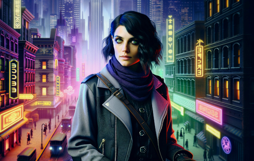 A woman with a leather jacket and scarf stands before a vibrant, neon-lit cityscape at twilight.