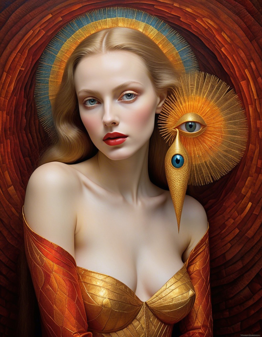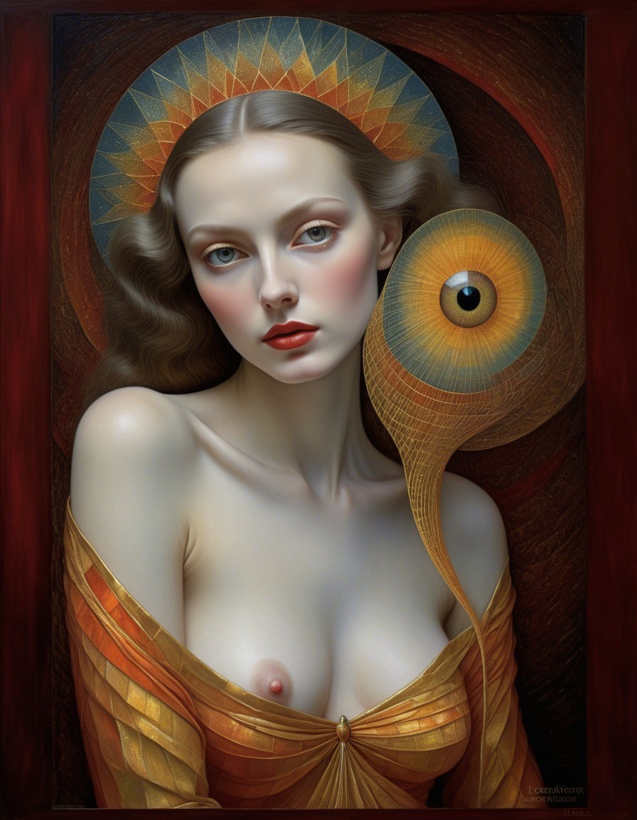 A single image, psychedelic siren, style of Alex Grey, style of Remedios Varo, style of Paul Klee, style of Leonora Carrington, eye contact, soft, beautiful delicate interplay of light and shadows on every surface, exotic, vivid, radiant, kaleidoscopic, highly colorful, most complex and highly intricate, dominant golden and rouge colors, highly intricate and utterly complex designs and patterns, exciting.